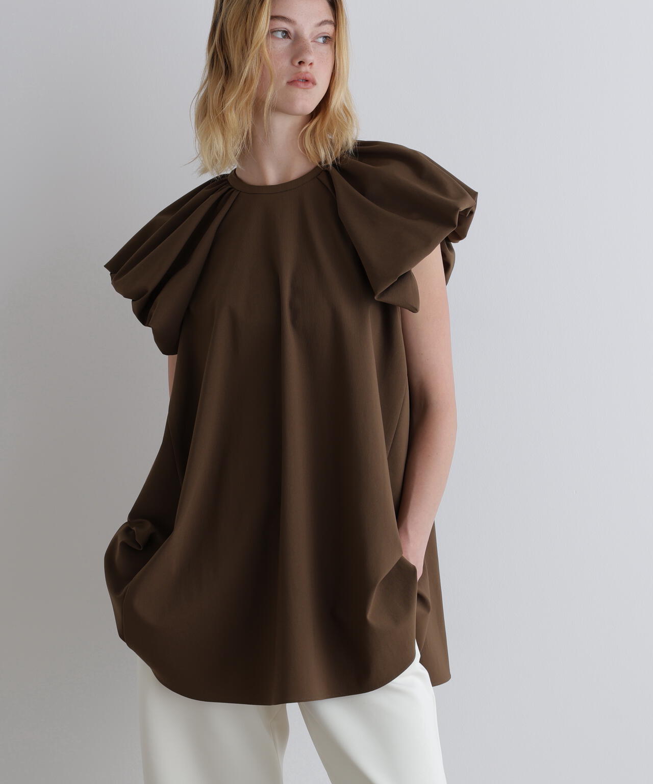 立体的なタックやドレープが生み出す、構築的なフォルムが魅力。シンプルながらも存在感のあるデザインです。