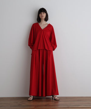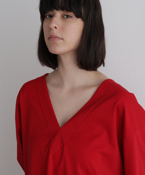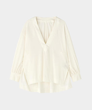 深めに開いたVネックラインがデコルテを美しく演出し、抜け感をプラス。