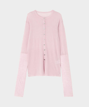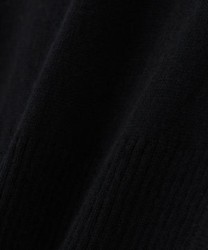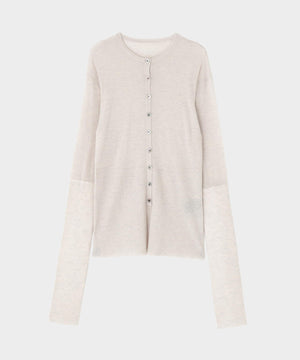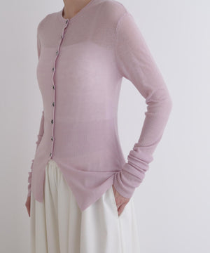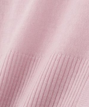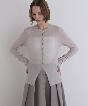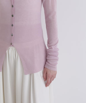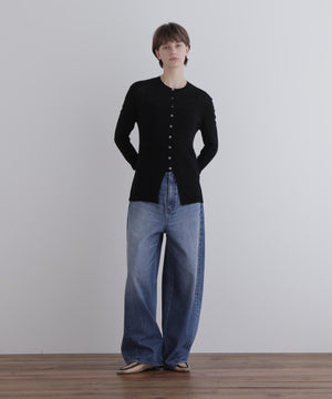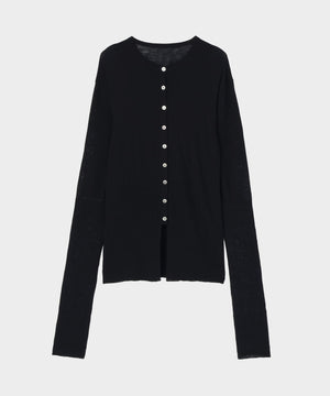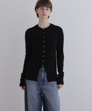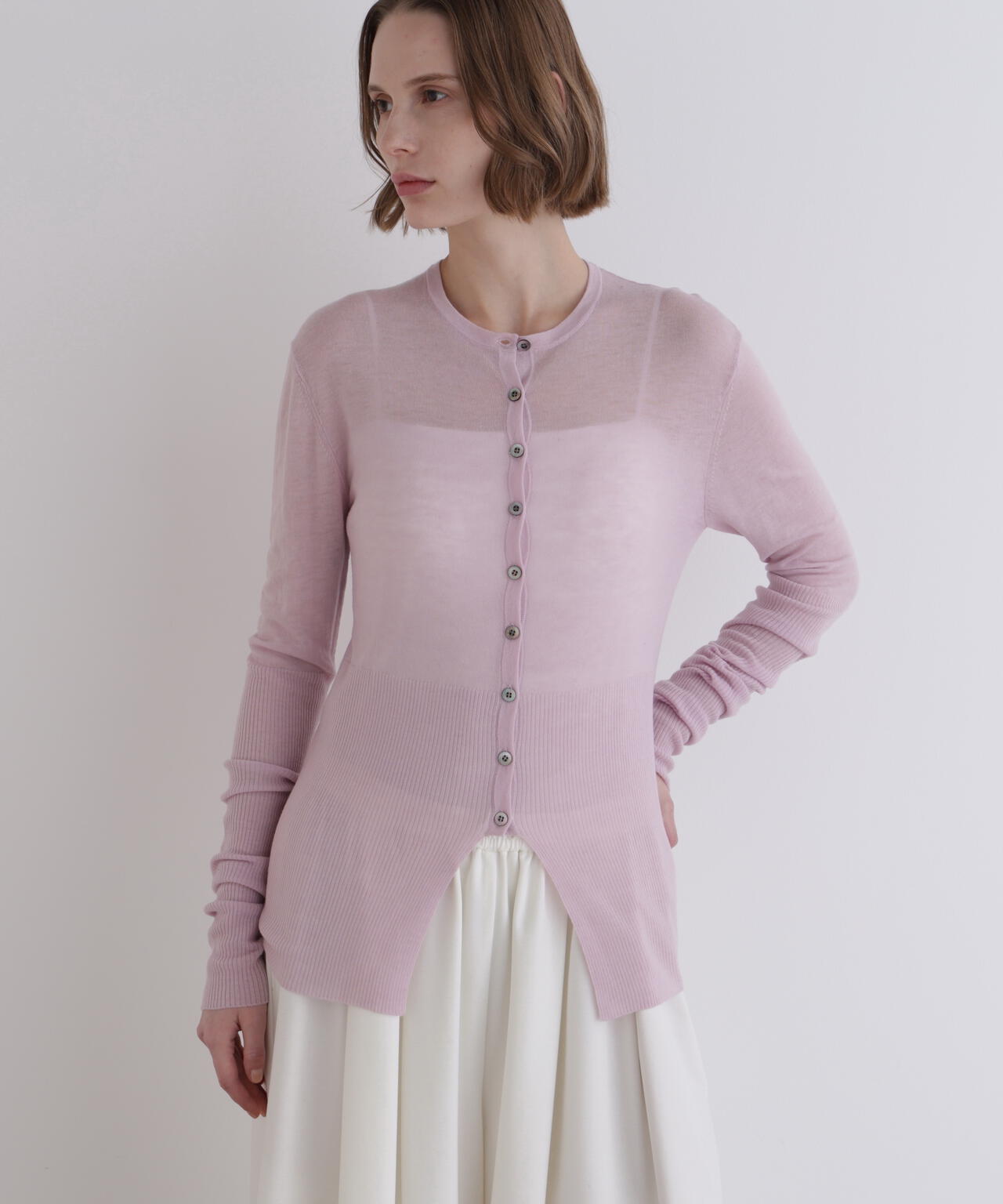 前立てのボタンや袖と裾に施された編み替えが、シンプルな中に奥行きを添えるアクセントに。