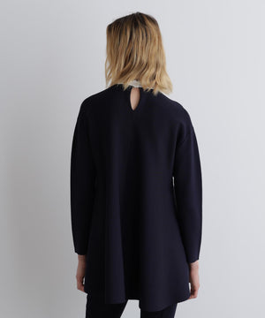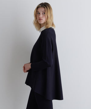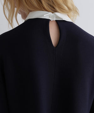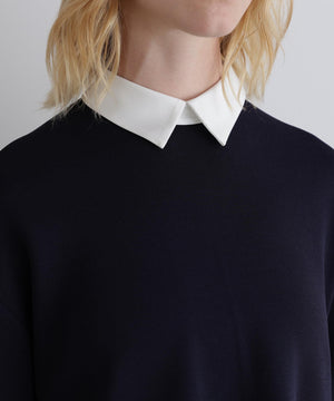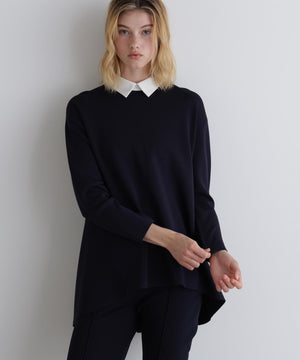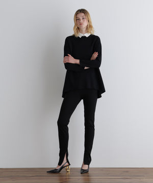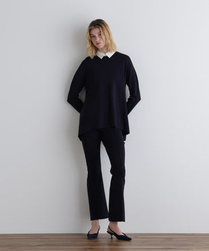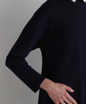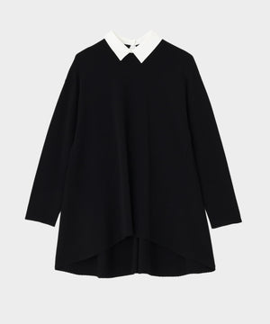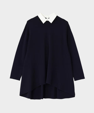 クラシカルな襟ディテールと、裾に向かって広がるフレアシルエットが絶妙なバランスを生み出すニットトップス。