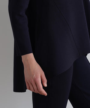 上品な合繊糸を使用し、厚みのある編地で仕立てることでニットならではの柔らかさと適度なフォルムを両立。
