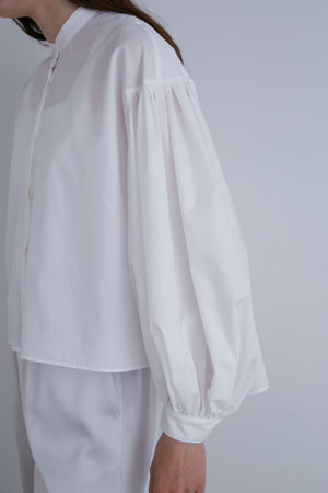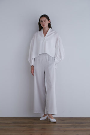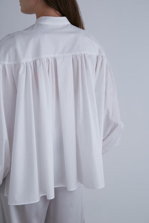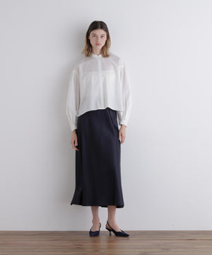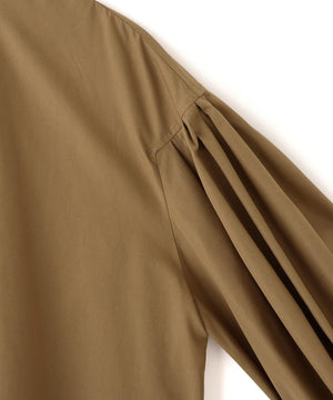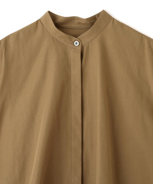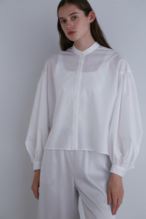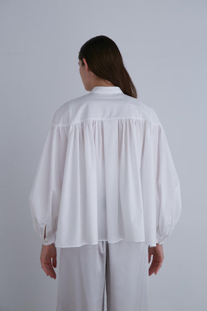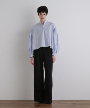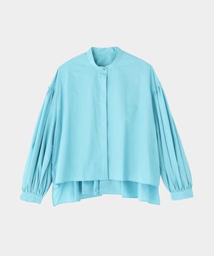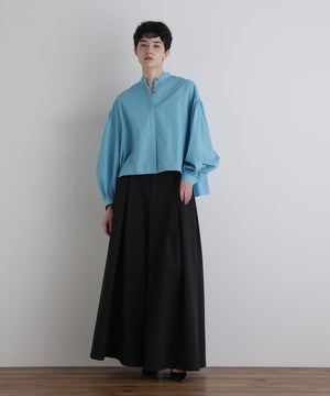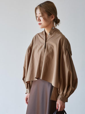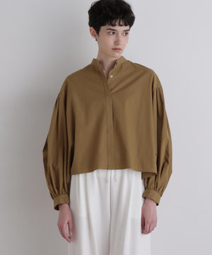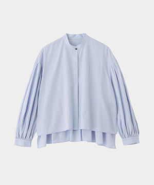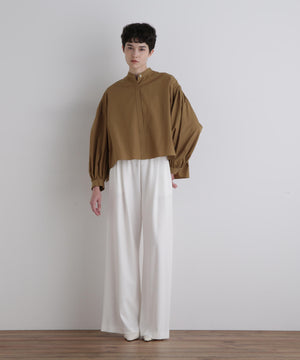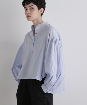 ライトなイージーケアシャツ素材を使用し、分量感やフォルムを立体的に表現したオーバーブラウス。