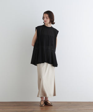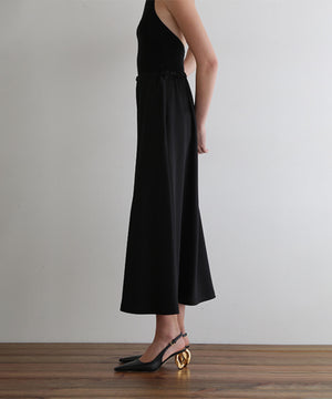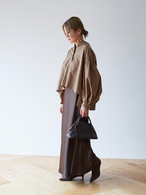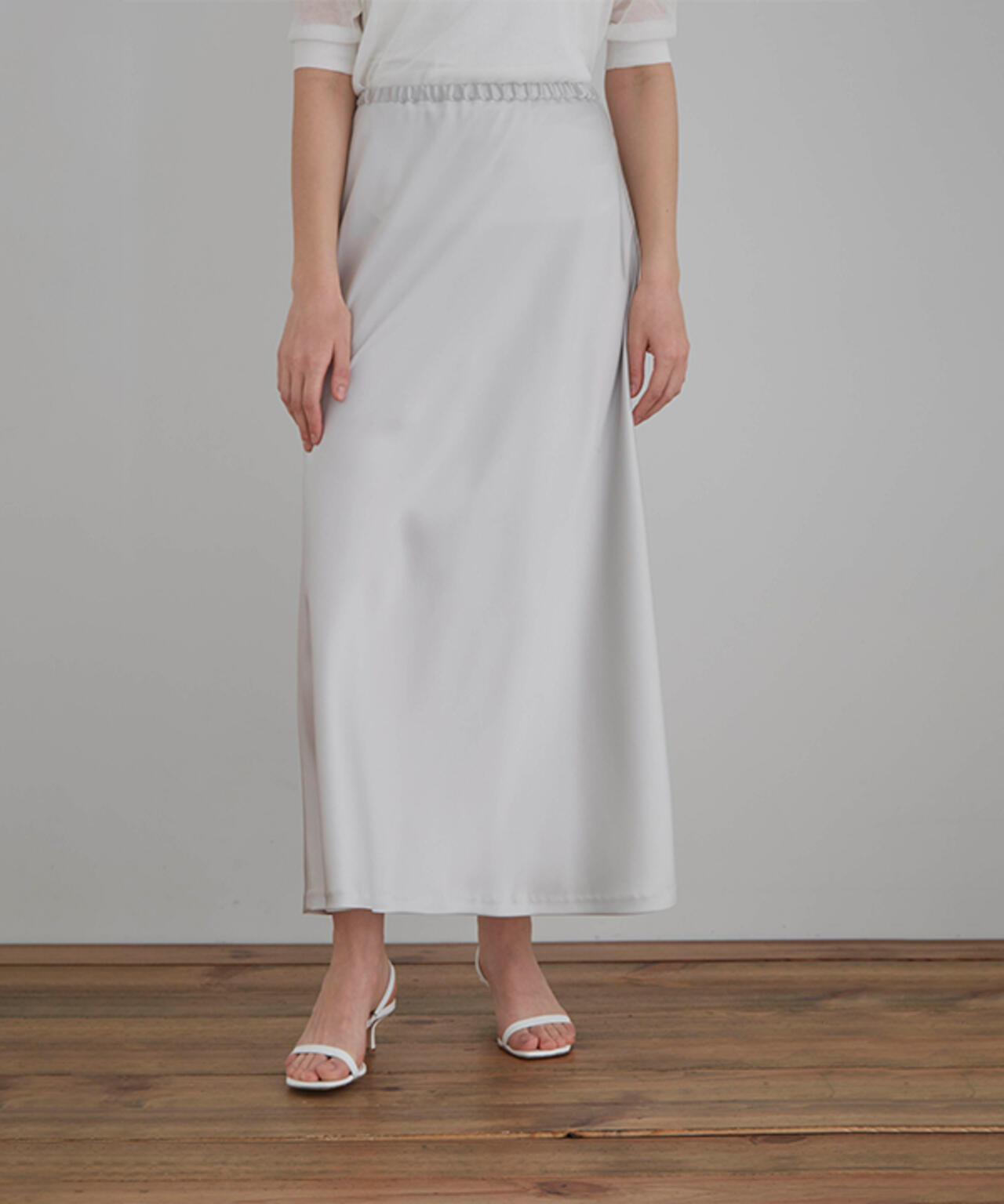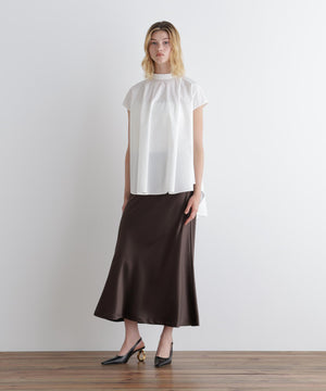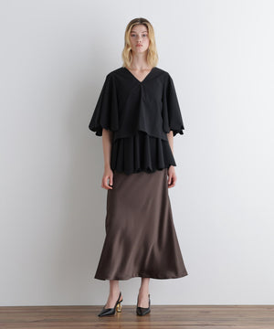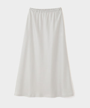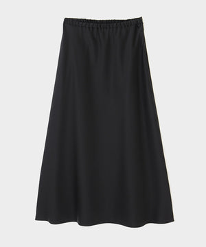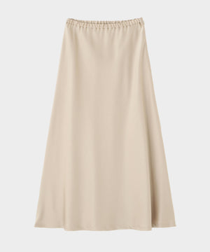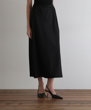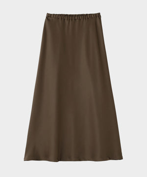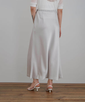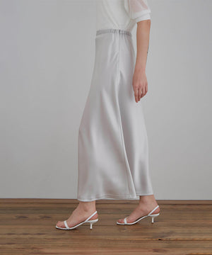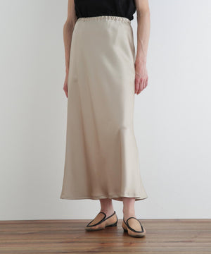 裾にかけて緩やかに広がるナローシルエットのサテンスカート。
