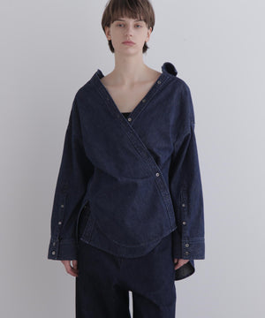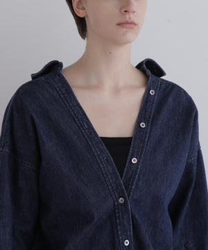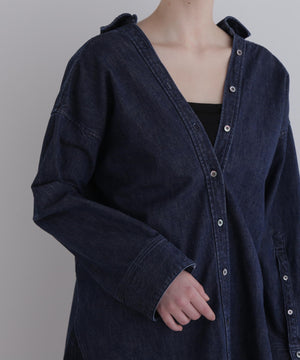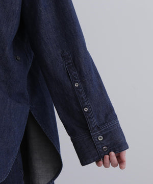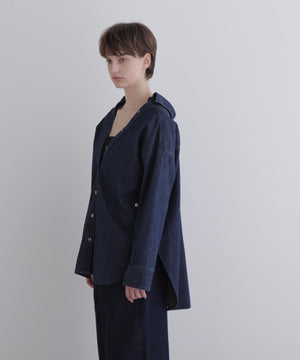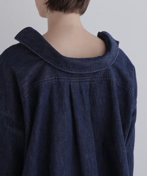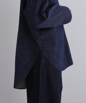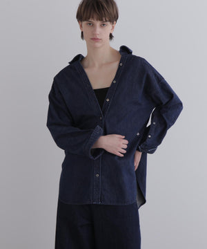 メンズライクなオーバーサイズのデニムシャツです。 最初から首が抜ける設定のパターンで立体的に作っており、首周りをきれいに肌見せすることができます。 袖には長めのスリットを入れているのもポイントです。 細身パンツやレギンスと合わせてスポーティに着用するのがおすすめです。