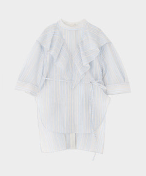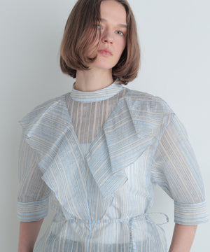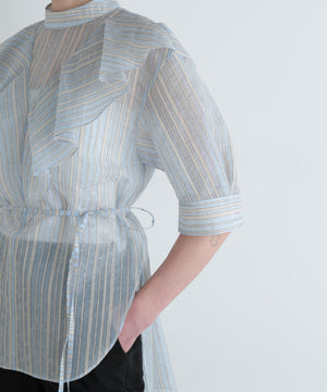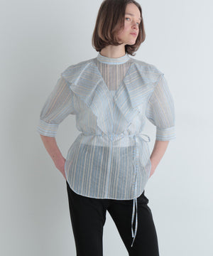 山形のジャカード産地で特別に織り上げた、縦ナイロンのシアーストライプ素材を使用したラッフルブラウス。