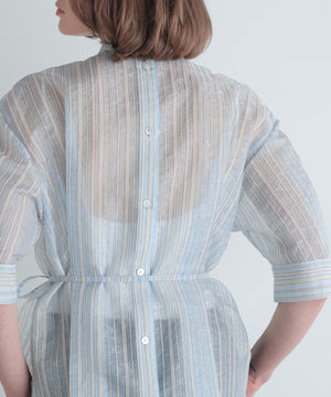 軽く透ける素材ながら、縦方向のストライプが視覚的にすっきり見せてくれるため、一枚着でもレイヤードでもバランスが取りやすく、春夏のスタイリングに抜け感をプラス。