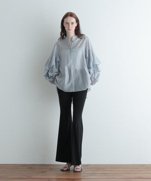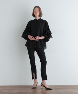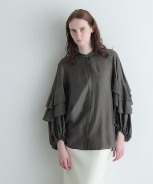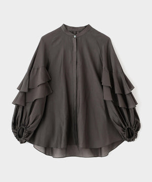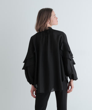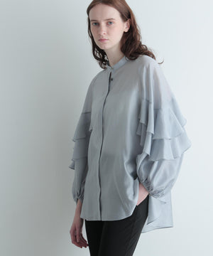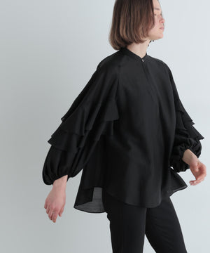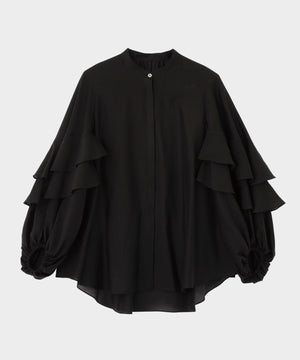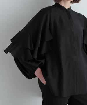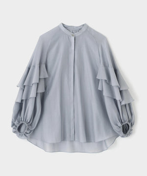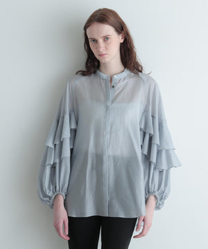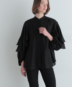 袖にあしらった大胆なフリルが特徴のシアーブラウスです。