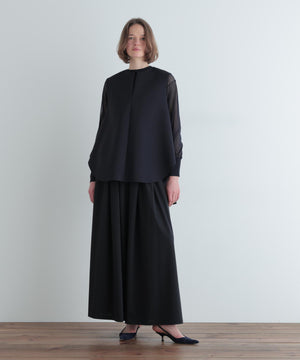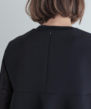 一見シンプルながらも、計算された前後差のある丈感と立体的なシルエットがレイヤードスタイルに奥行きをプラス。