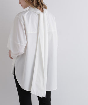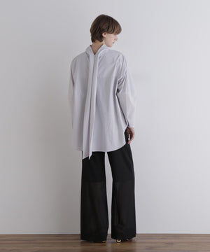 襟元から流れるように垂れたロングボウタイが、エレガントでありながらもシャープな印象を演出。