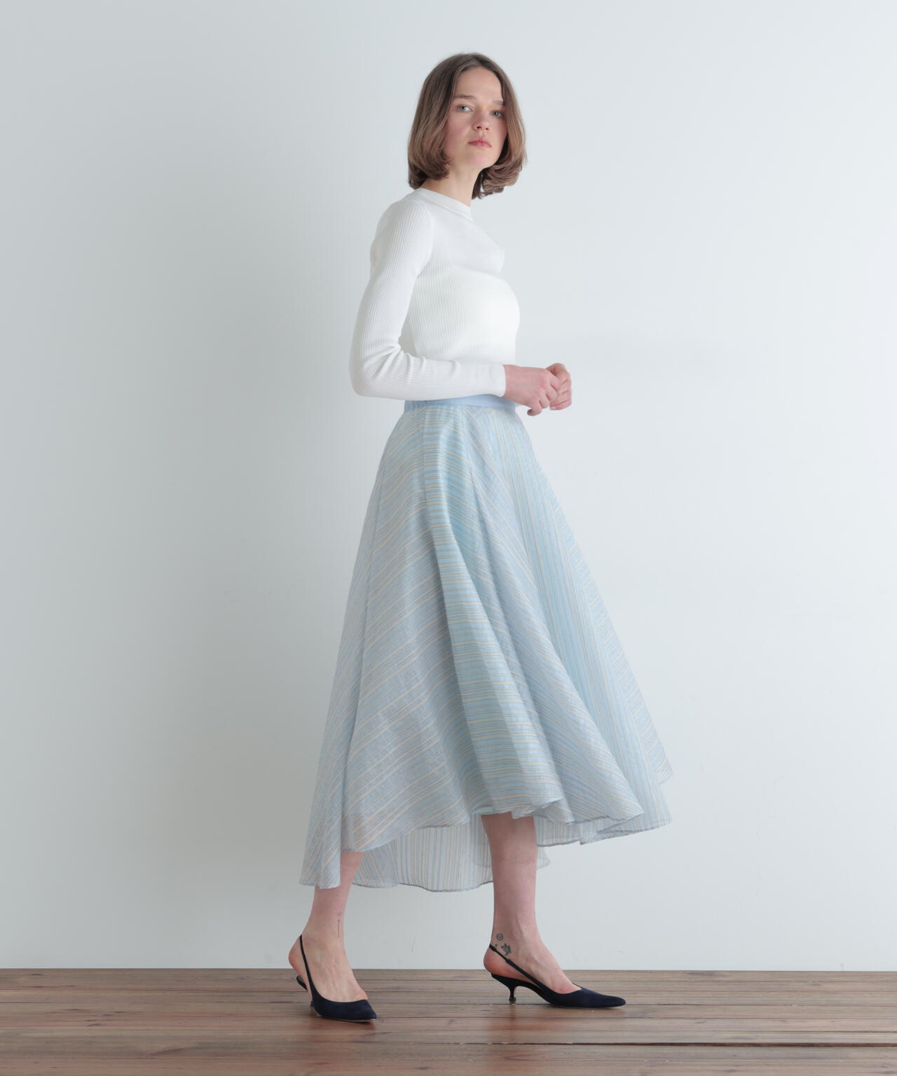 軽やかな透け感と、織りによって生まれる繊細な縦ラインが、歩くたびに上品な陰影をつくり出します。