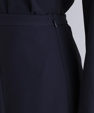 同素材のラッフルディテールブラウスとのコーディネートでは、素材の統一感が際立ち、セットアップのような洗練された印象に。ブラウスのAラインとスカートの縦長シルエットが美しいバランスを生み出し、モードなスタイリングに知性と奥行きを添えます。足元にはミニマルなヒールやブーツを合わせることで、素材とフォルムの美しさがより引き立ち、シンプルながらも強い意志を感じさせる装いに。