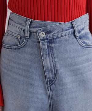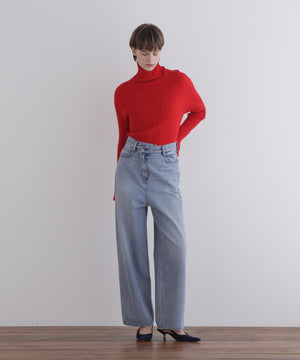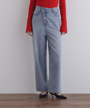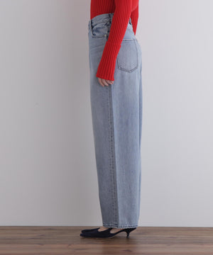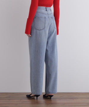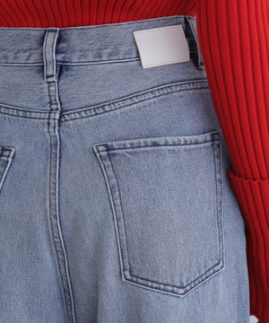 しっかりとした厚みと柔らかさを兼ね備えたデニム素材を使用し、股上を深めに設定することで、腰まわりに安心感と構築的な美しさを両立。