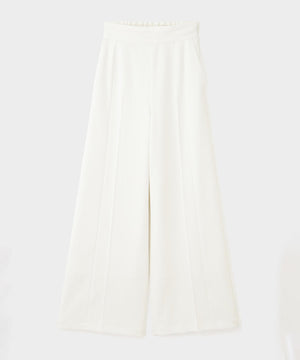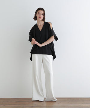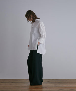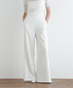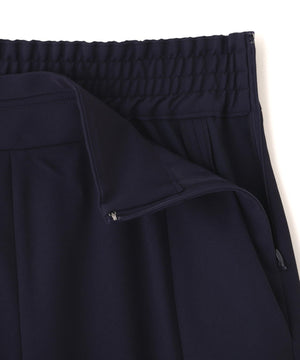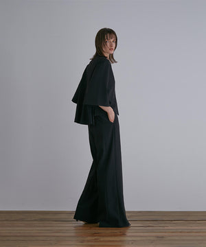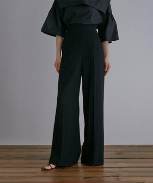フロントのタックが立体的なシルエットを生み出し、美しいドレープ感を演出します。ウエストベルトは太めに持たせ、腰高に。