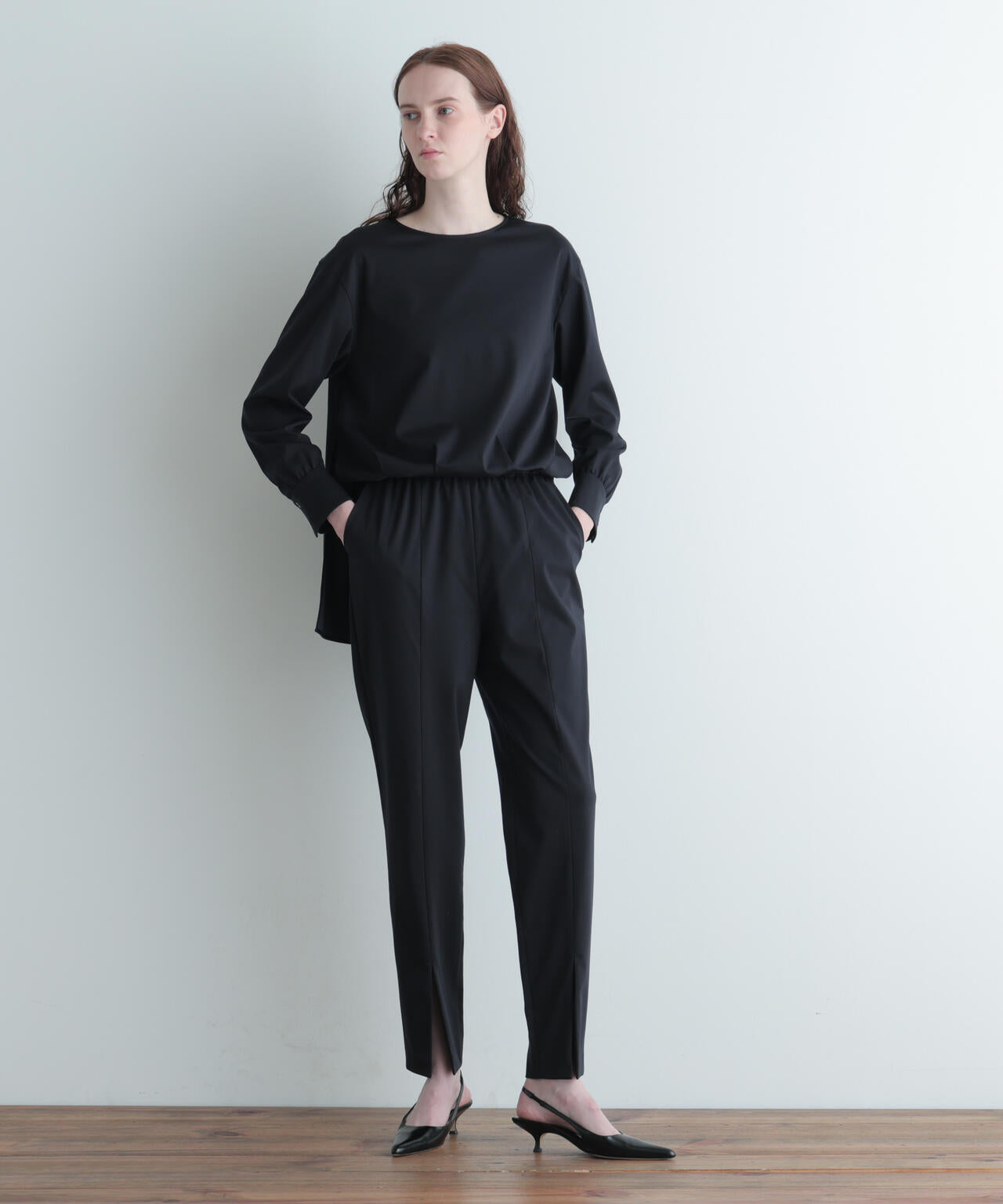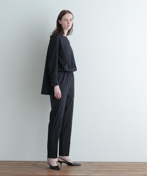パンツにはフロントに長めのスリットを施し、動きに合わせて軽やかなニュアンスをプラス。