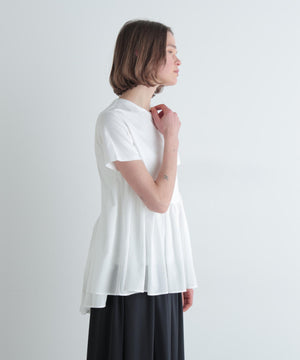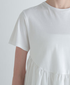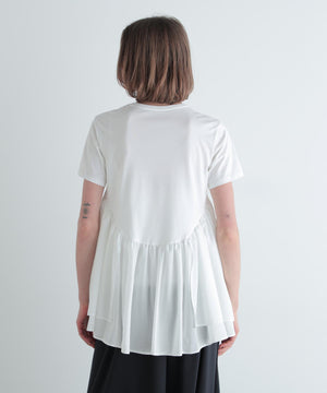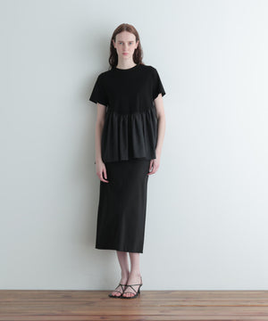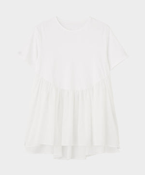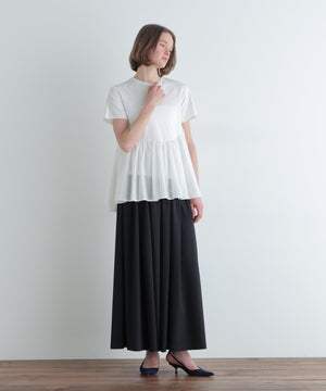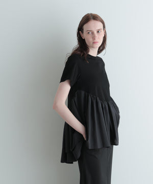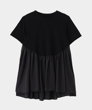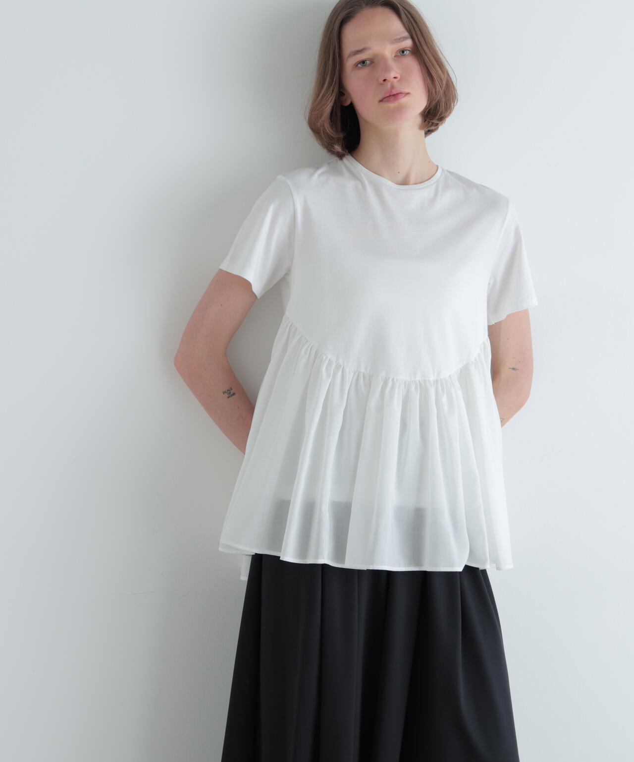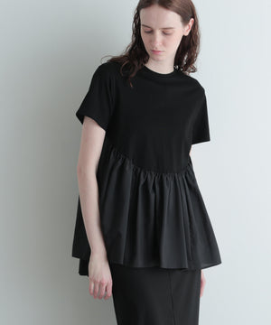上身頃に柔らかなコットンジャージ、下身頃に軽やかなポリエステルスパンローンを組み合わせた異素材コンビのトップス。