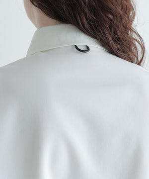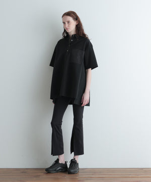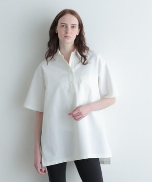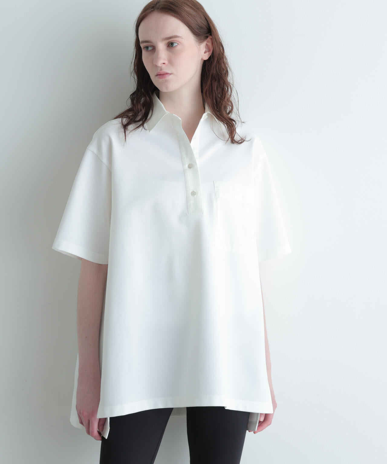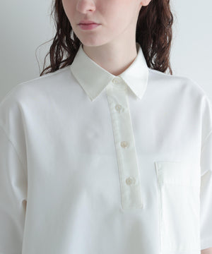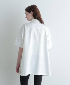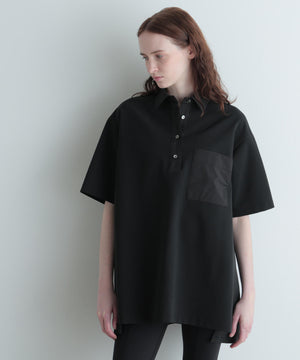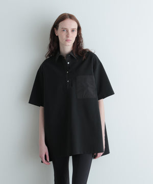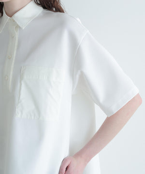 光沢のあるタフタと、SOLOTEXダンボールジャージーを組み合わせ、異素材ミックスで仕立てた大人のポロシャツ風トップス。