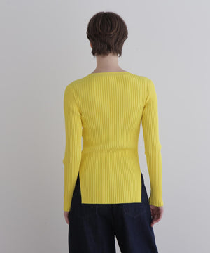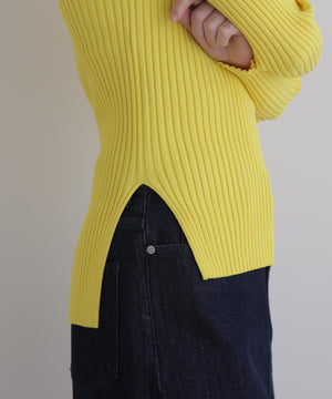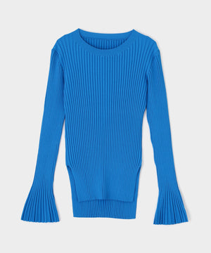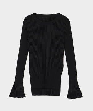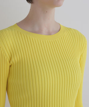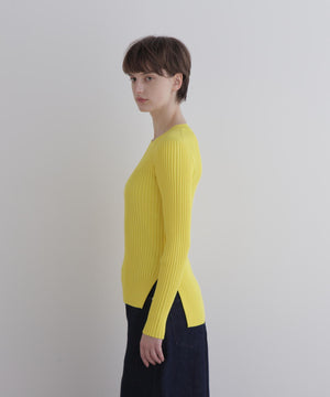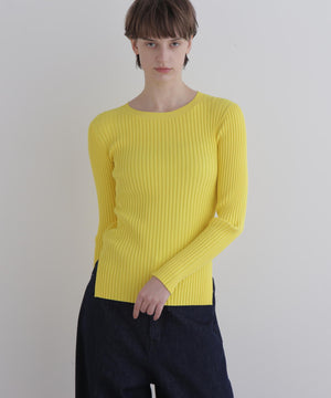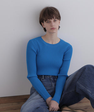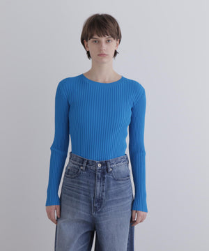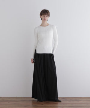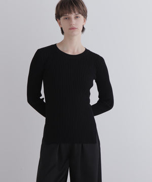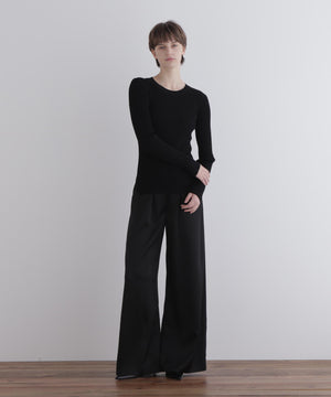 しなやかな落ち感と上品な艶を持つヴィスコース混素材を使用した、ワイドリブ編みのクルーニット。