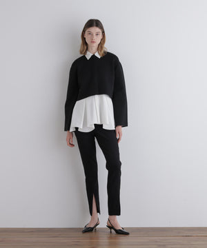 裾が長めのブラウスや裾フリルのインナーなどと着用するとより素敵に仕上がります。