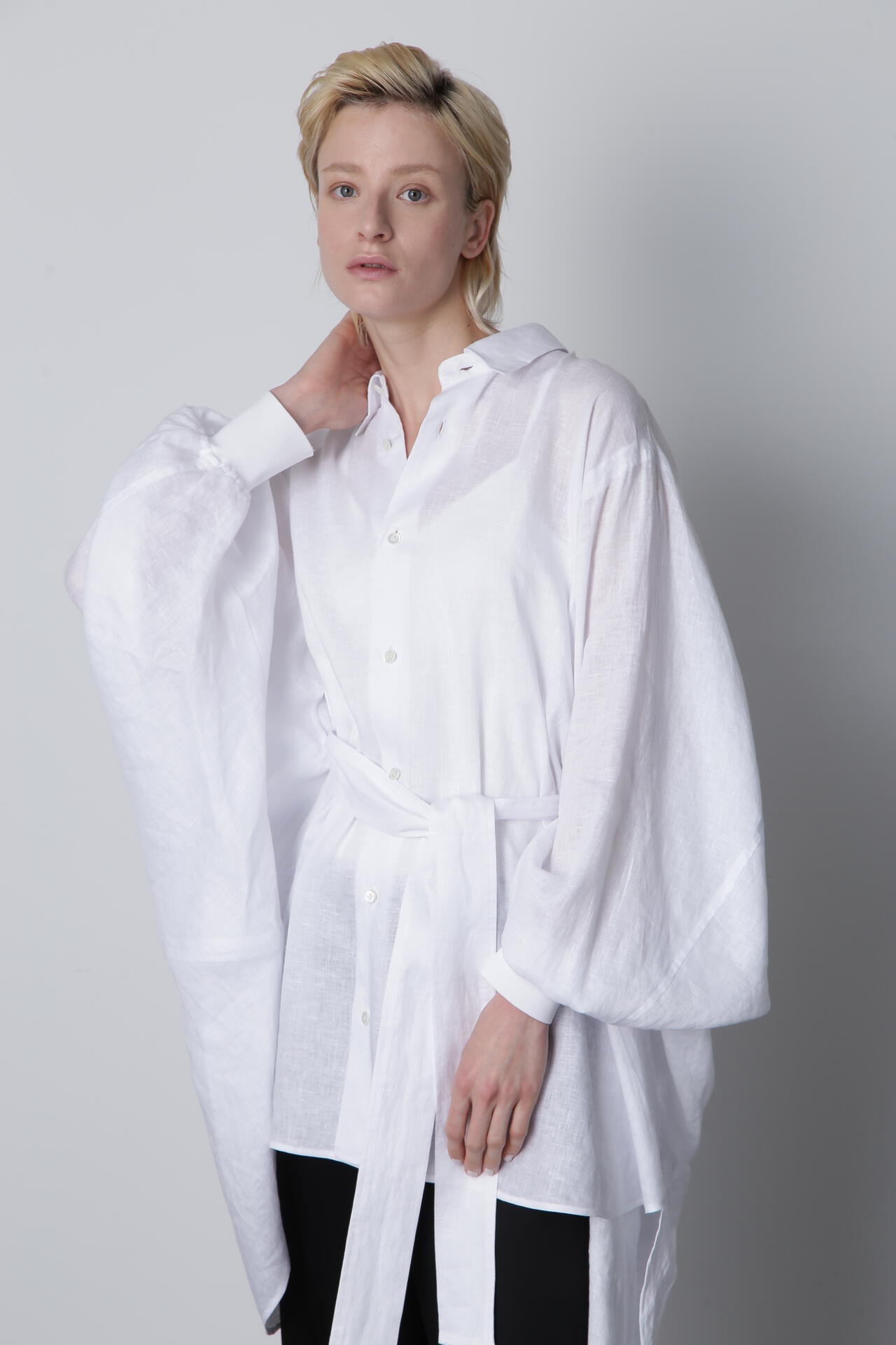 ポンチョのようなたっぷりとした身頃が特徴のオーバーサイズのベルテッドシャツです。