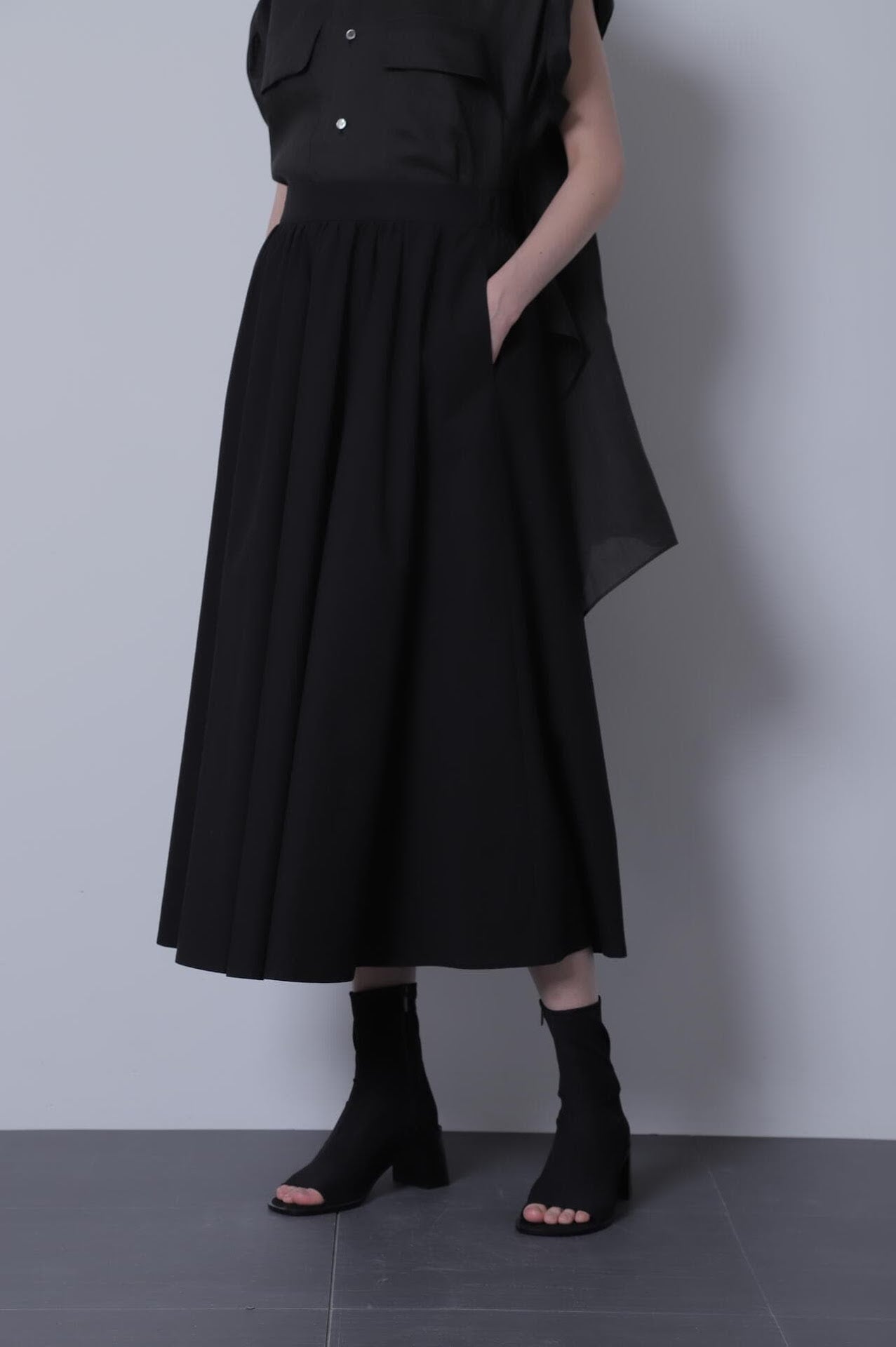 80/1超長綿を使用したシルクのように柔らかく艶のある素材を、特殊な加工で洗いざらした様なナチュラル感と反発感を出してあります。ウエストは総ゴム仕立てながら、フロントにはテンションをかけずすっきりとした見え感を作ってあります。またウエストのギャザーも少なくすることでギャザーフレアーながらすっきりとした印象に仕上げてあります。近江晒しのタイプライター素材は夏らしく爽やかな印象です。
