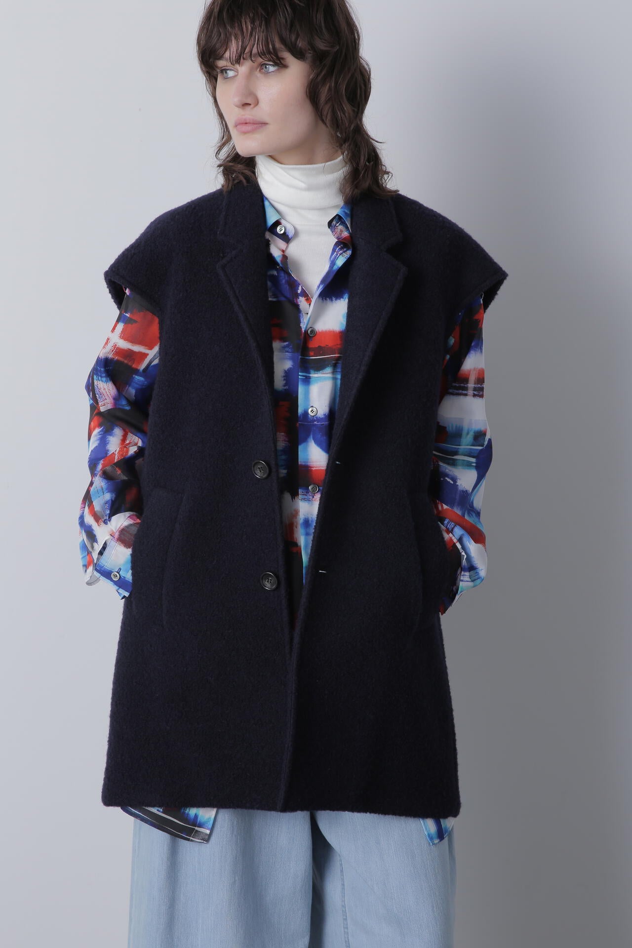 チェスターコートライクなテーラードカラーのジレはボンディング素材の張り感を生かしつつ、さらに特殊なパターン設計によりフォルミィ感とコクーン感ある独特のシルエットを生み出しています。