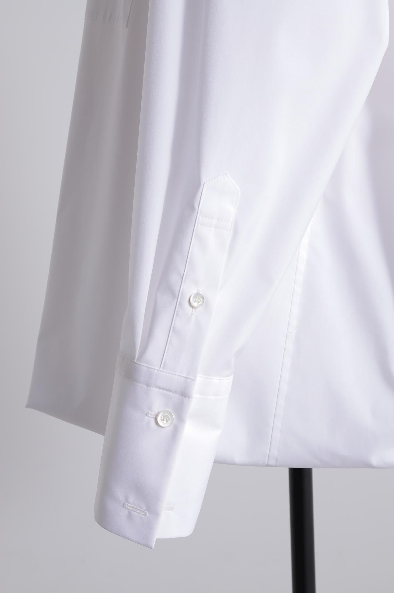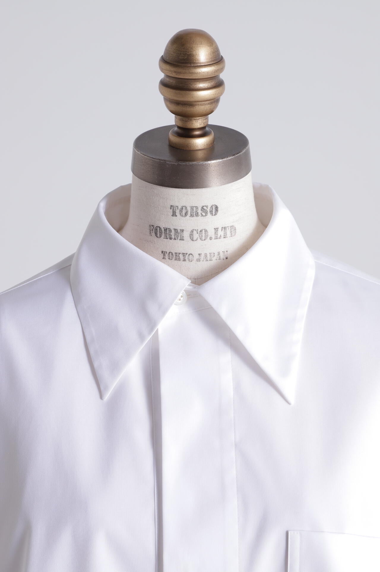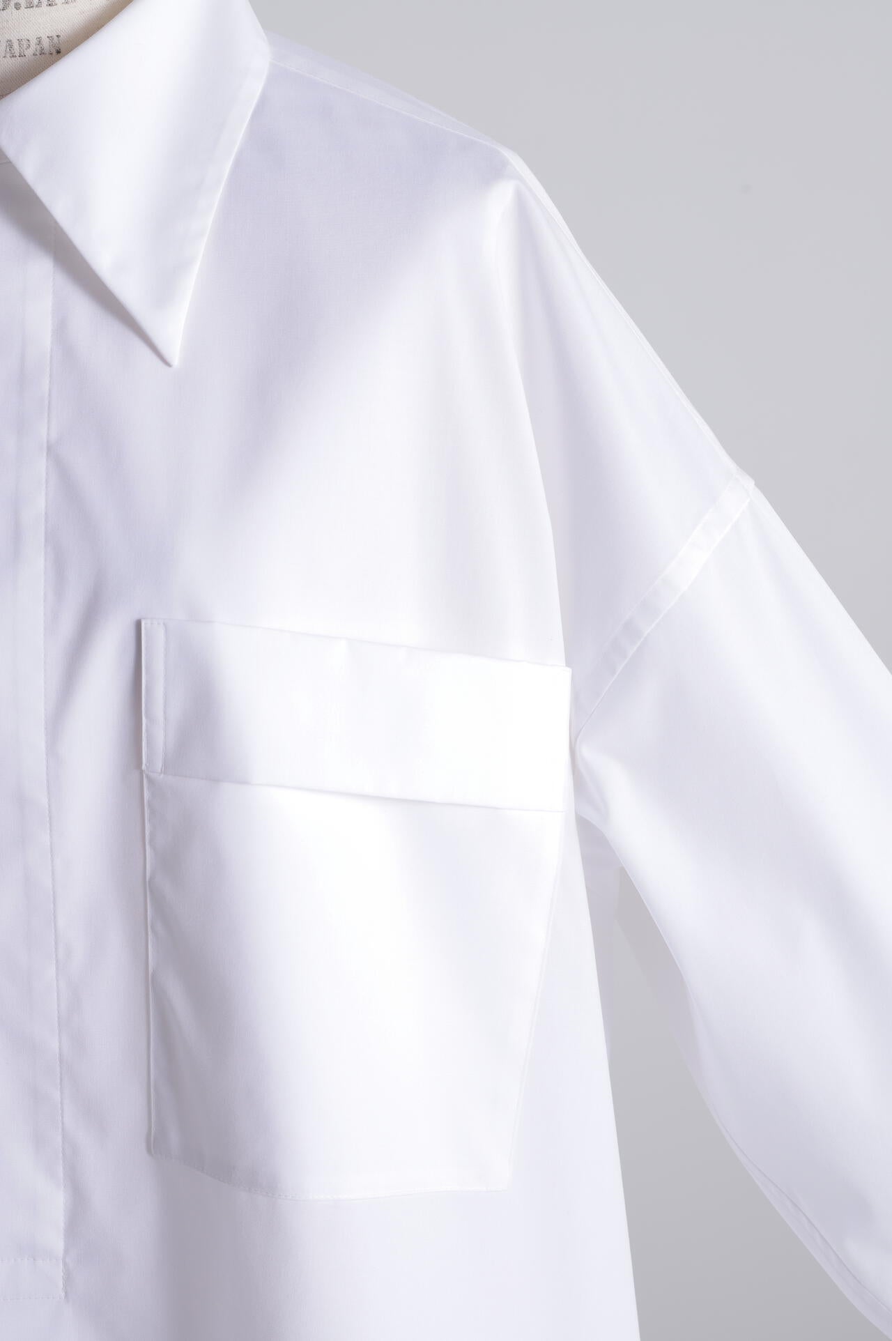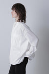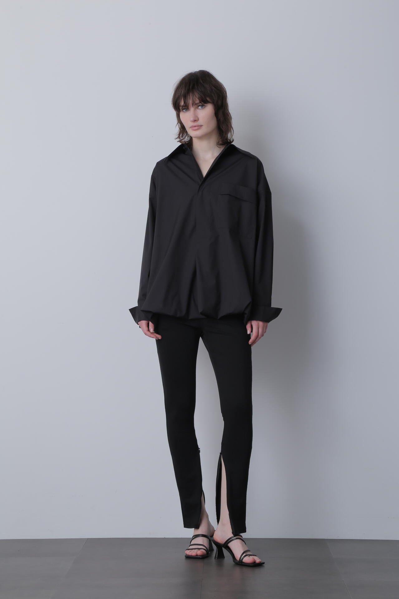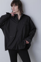 ソフトモード感あるバルーンシャツです。シャツの裾をブラウジングしたように見せるために薄い裏素材との二重仕立てにして、その裏地でシャツの裾を引き上げた特殊な仕様設計がポイントです。クリーンなシャツ素材にシャープな衿、ダブルカフスにもなる長いカフスにも抜け感があります。