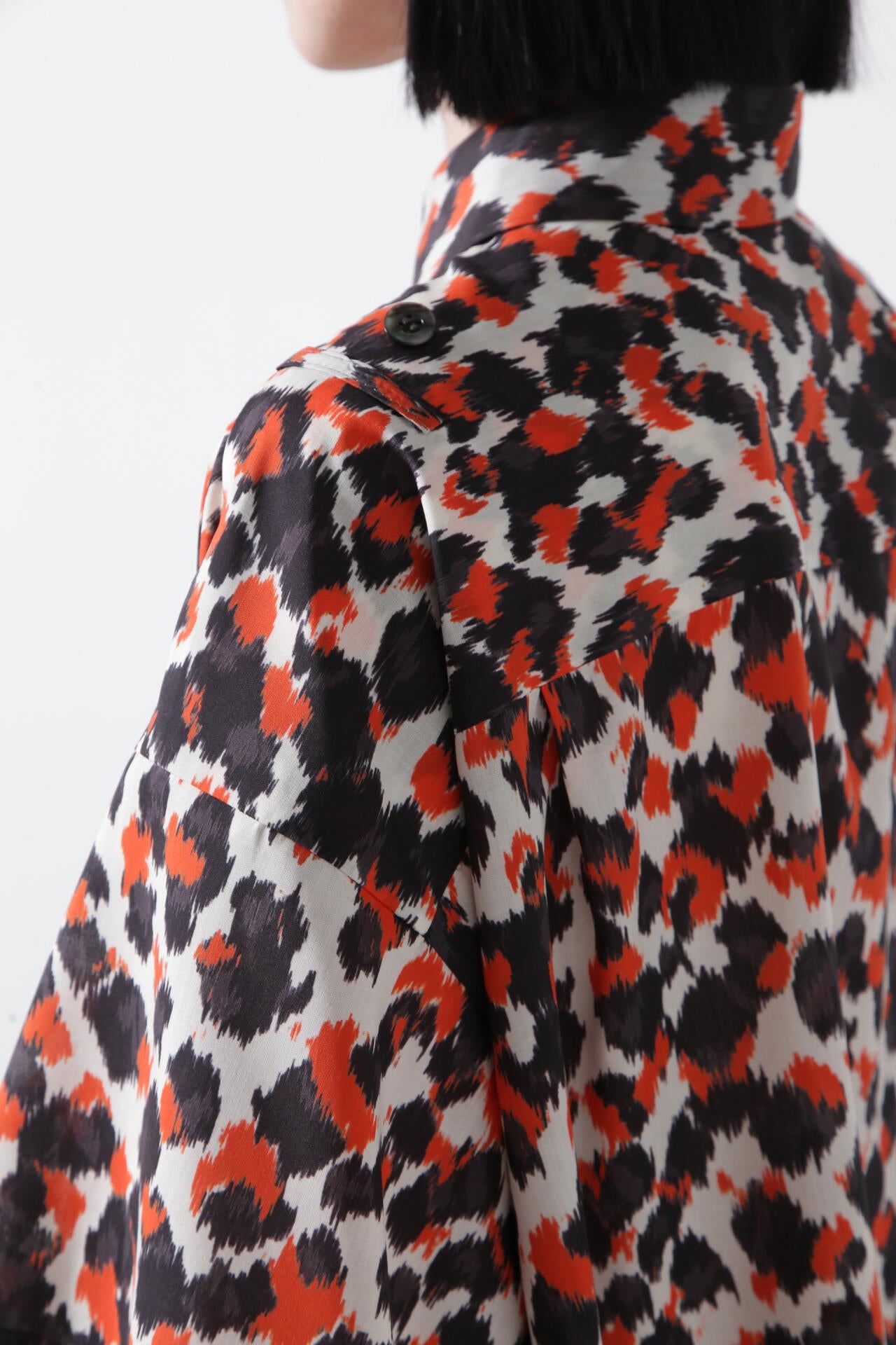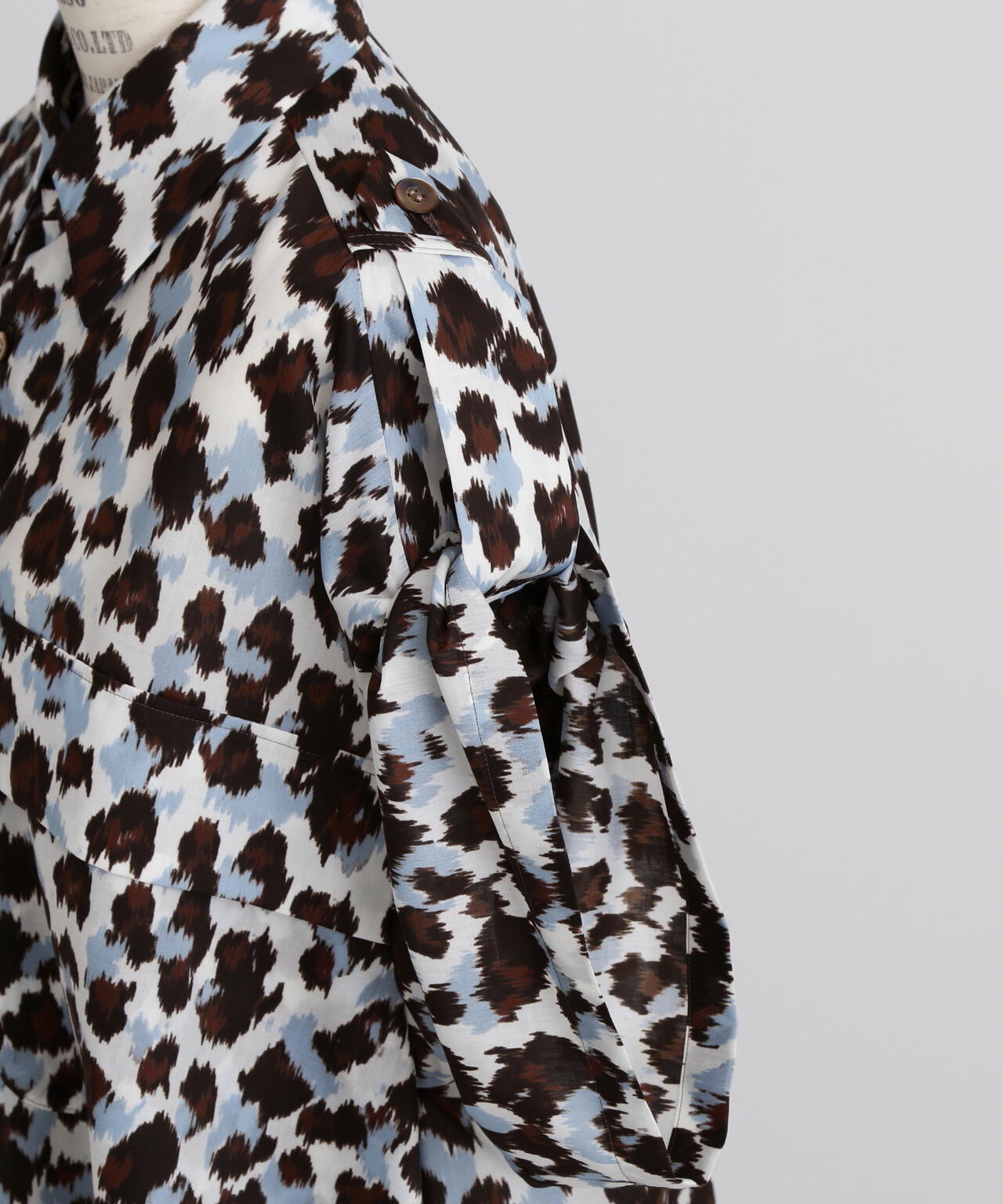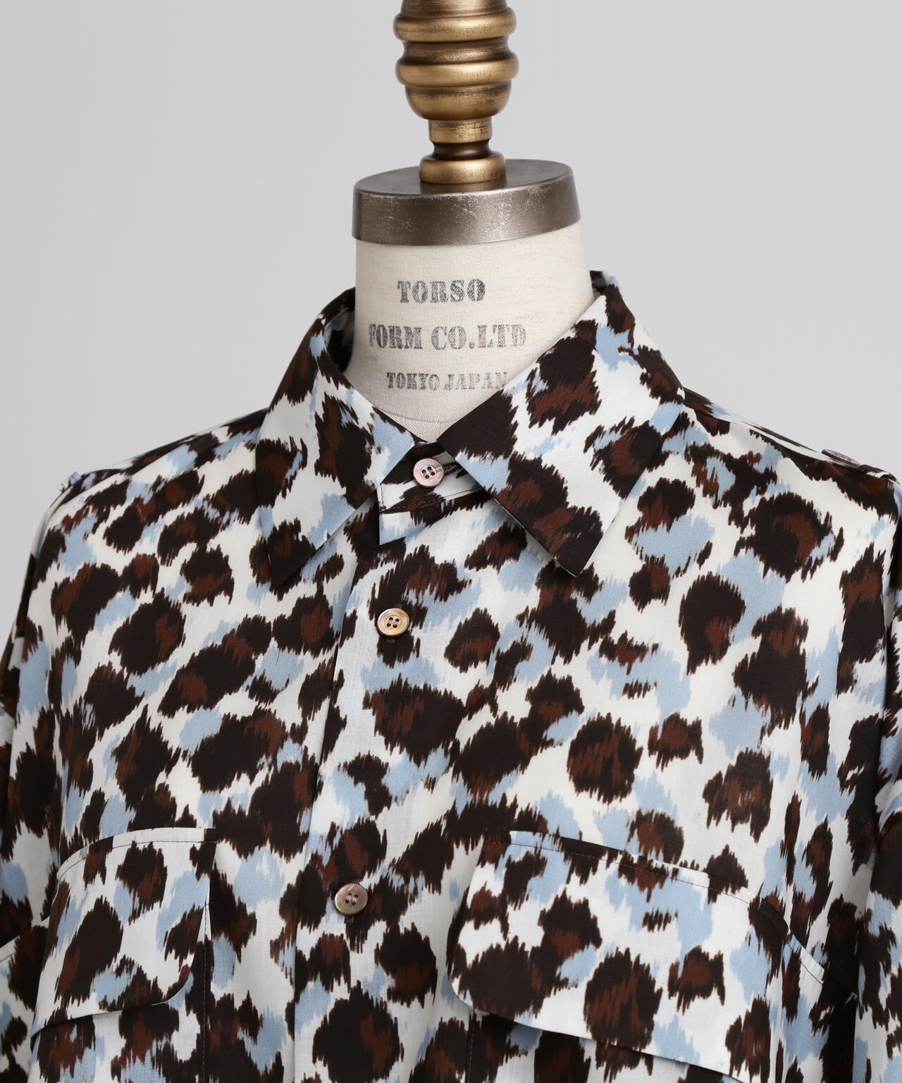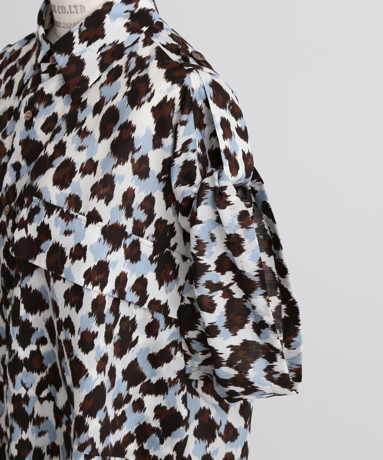 ドットとレオパードの中間イメージの柄はくどさがなくどなたでもスッキリ合わせていただけます。テントのようなたっぷりとした後身頃に抜け感のあるミリタリーディティールのシャツです。