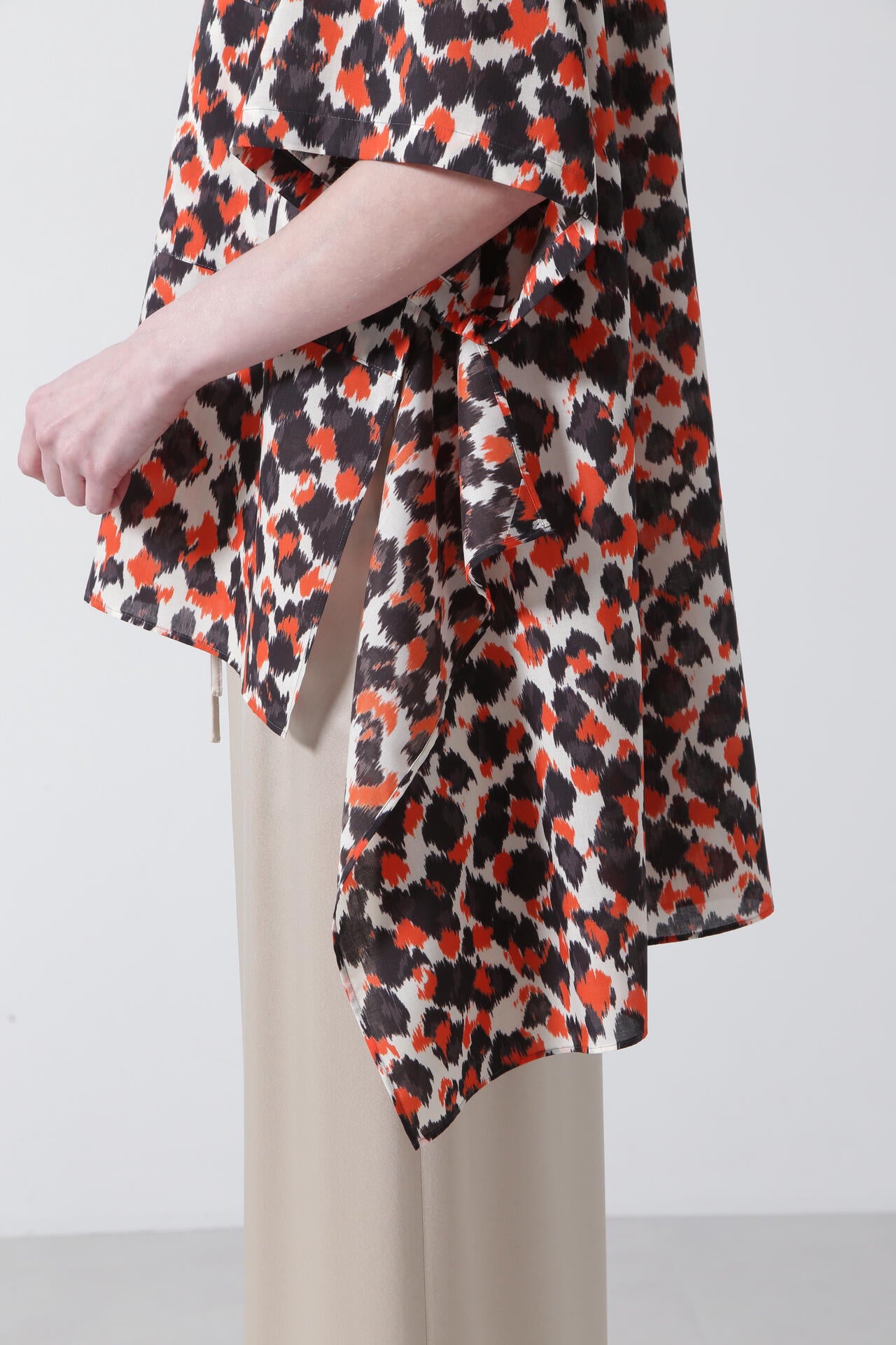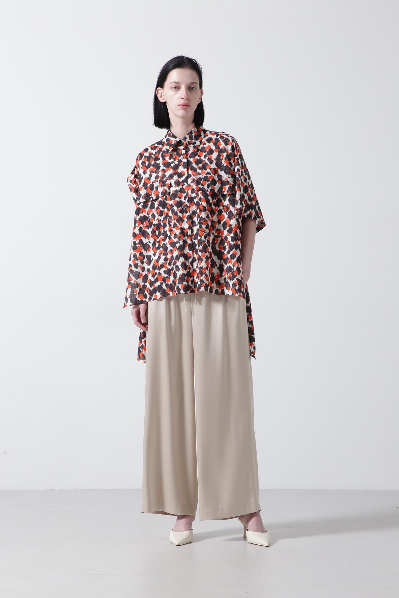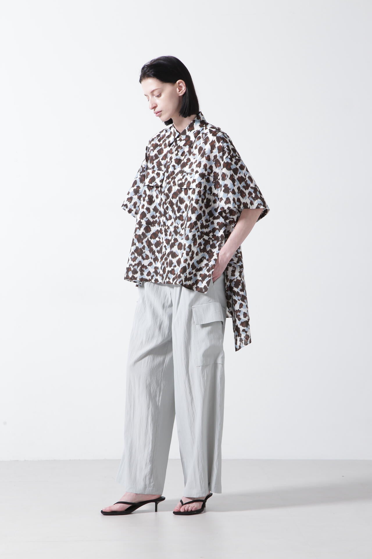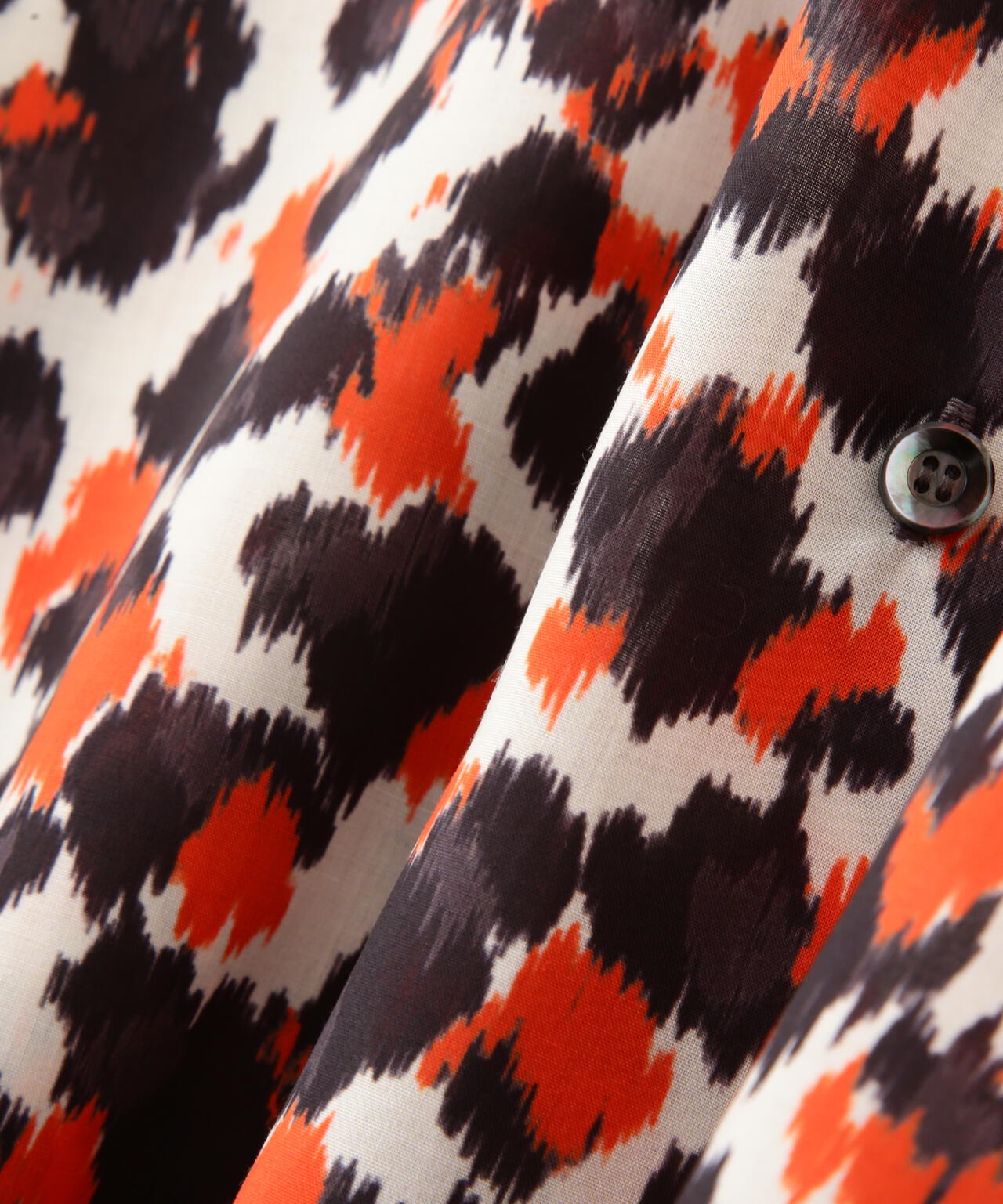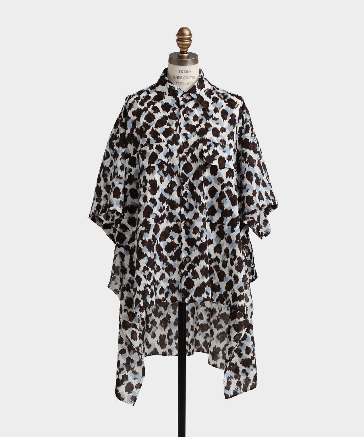 ドットとレオパードの中間イメージの柄はくどさがなくどなたでもスッキリ合わせていただけます。テントのようなたっぷりとした後身頃に抜け感のあるミリタリーディティールのシャツです。