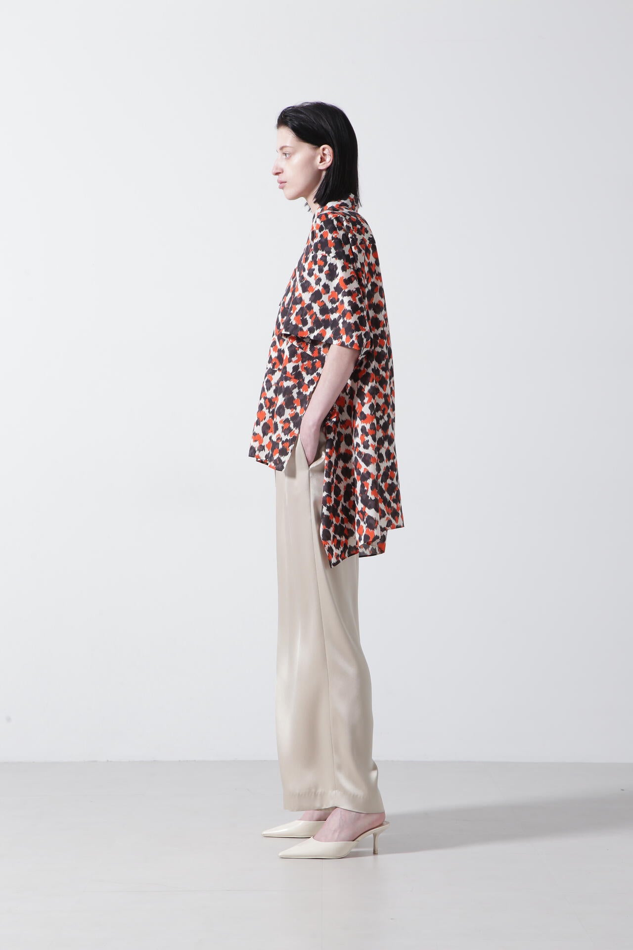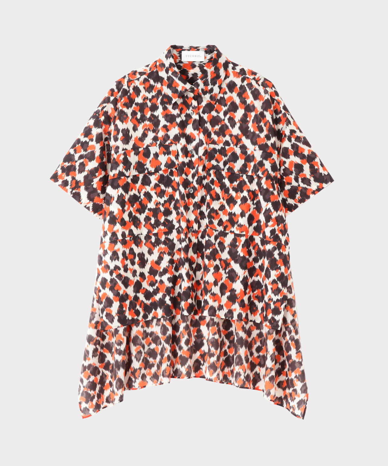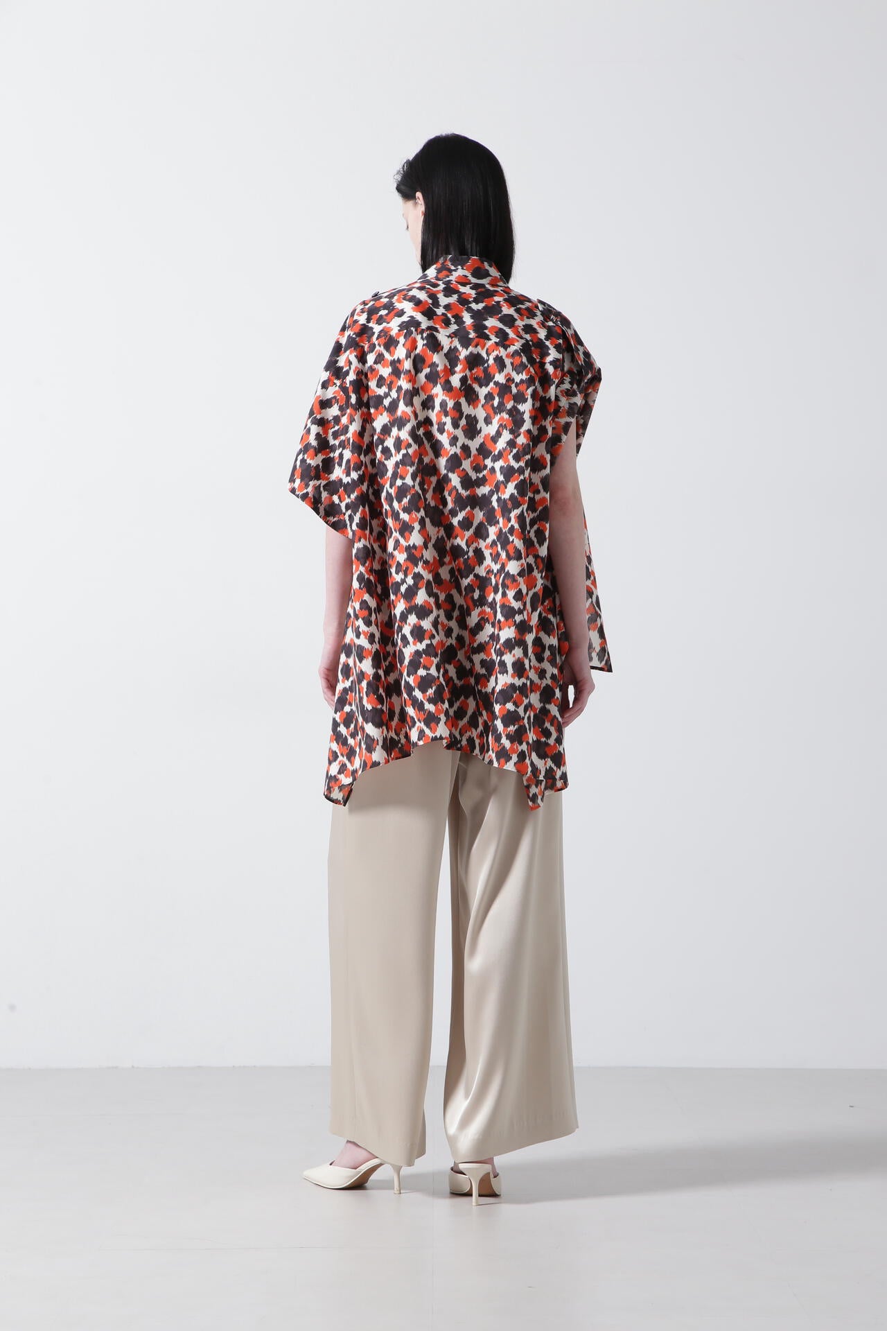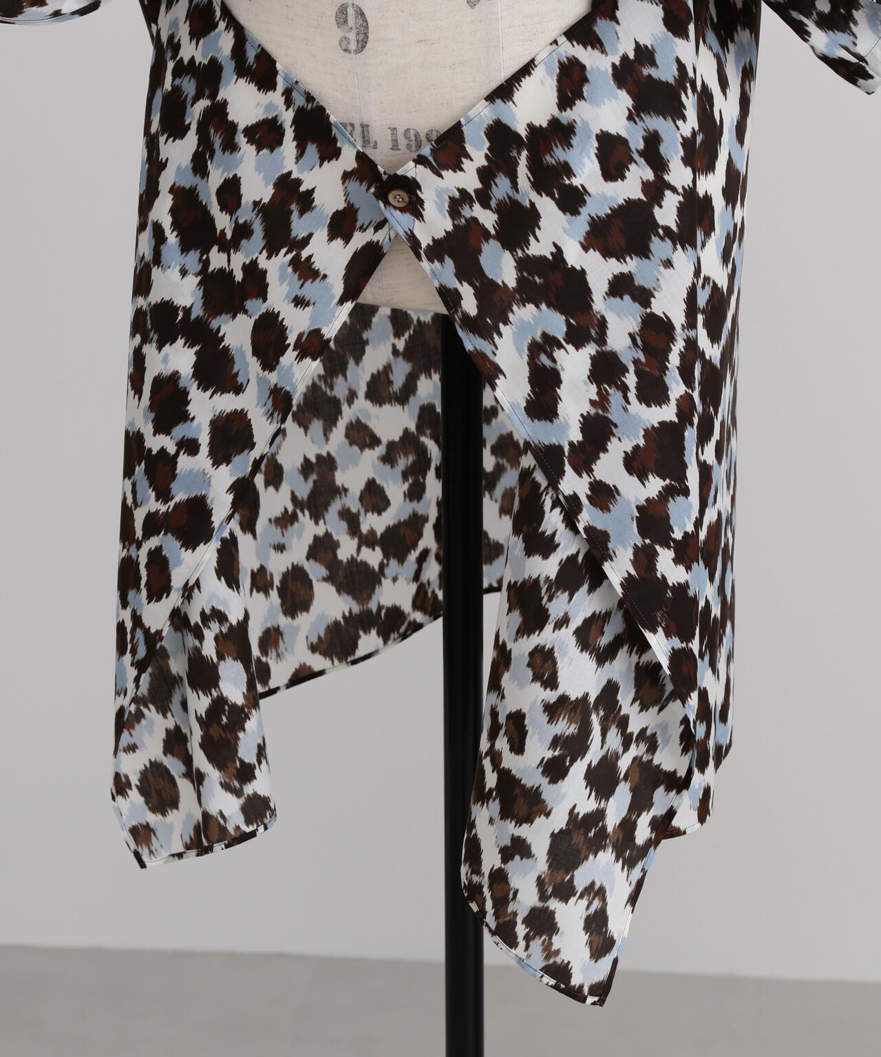 ドットとレオパードの中間イメージの柄はくどさがなくどなたでもスッキリ合わせていただけます。テントのようなたっぷりとした後身頃に抜け感のあるミリタリーディティールのシャツです。