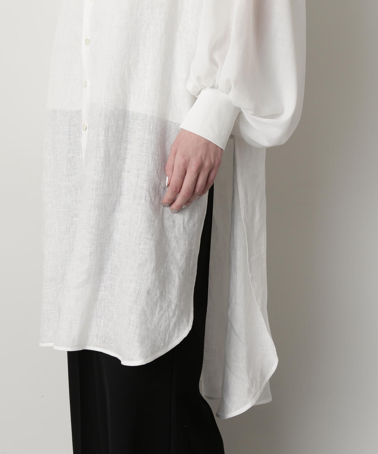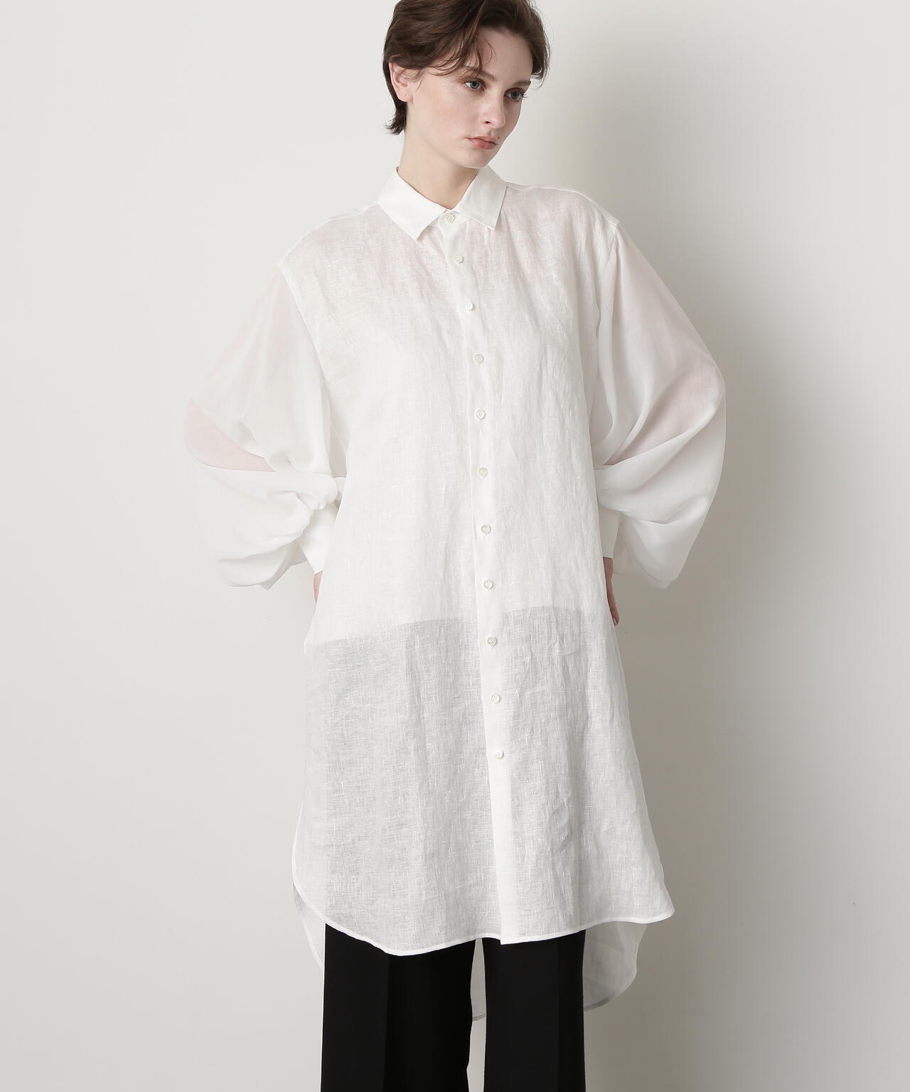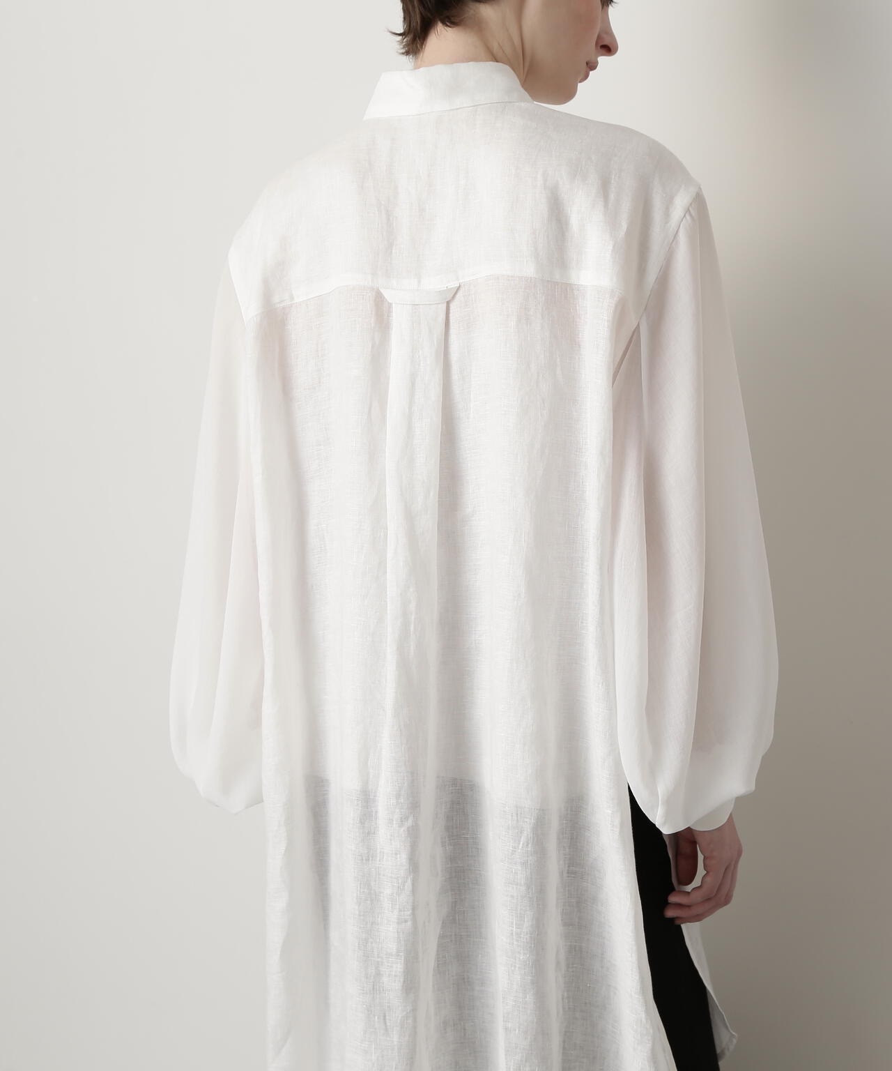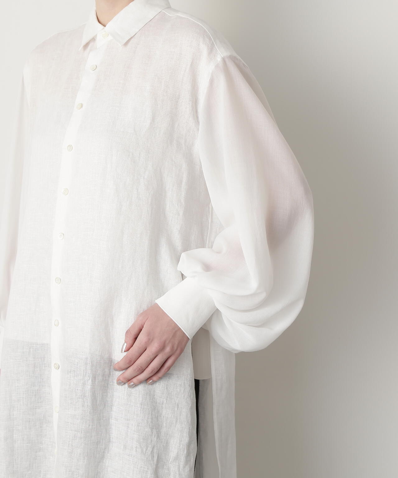 身頃に60/ーのリネン、袖に同系色のオーガンジーを使用したロングシャツです。