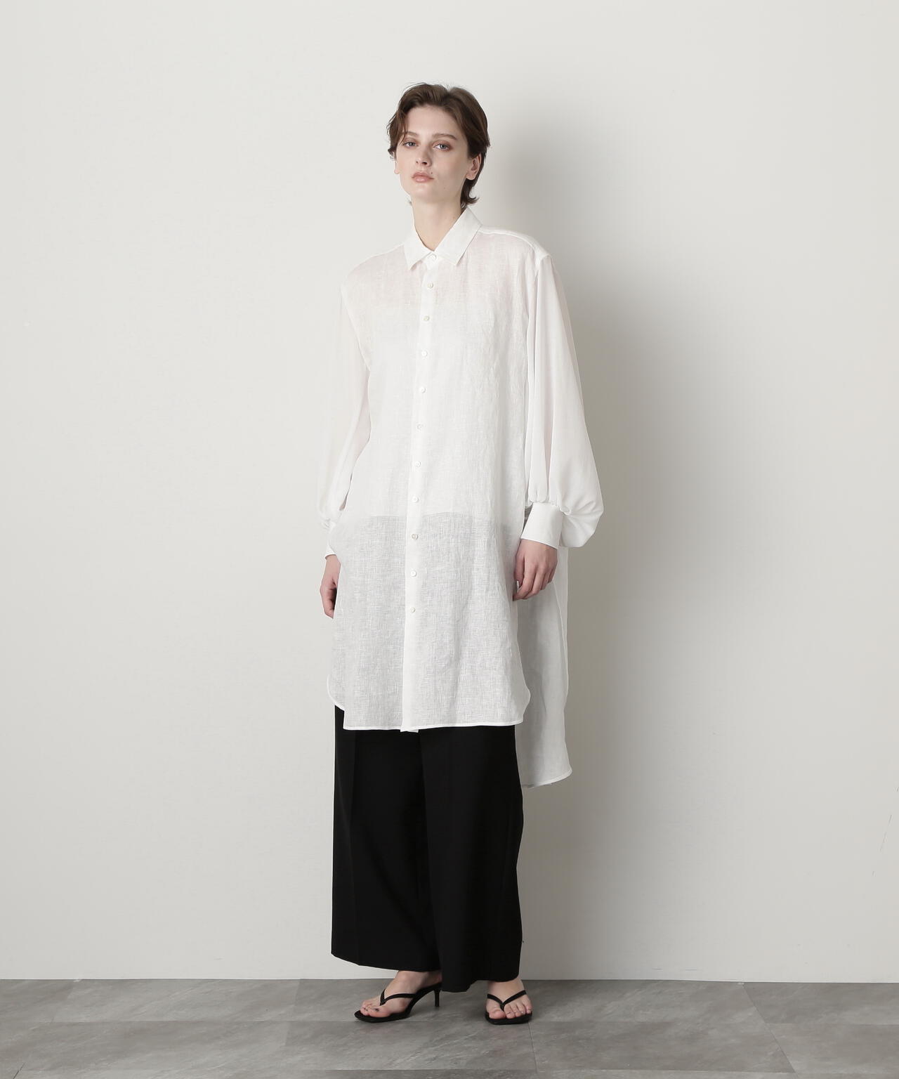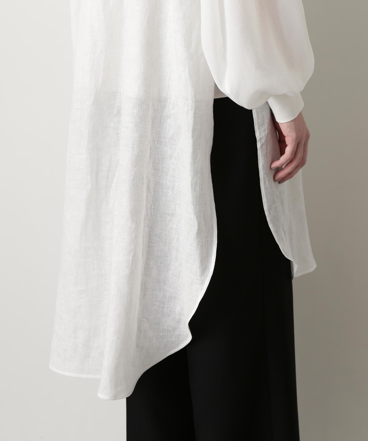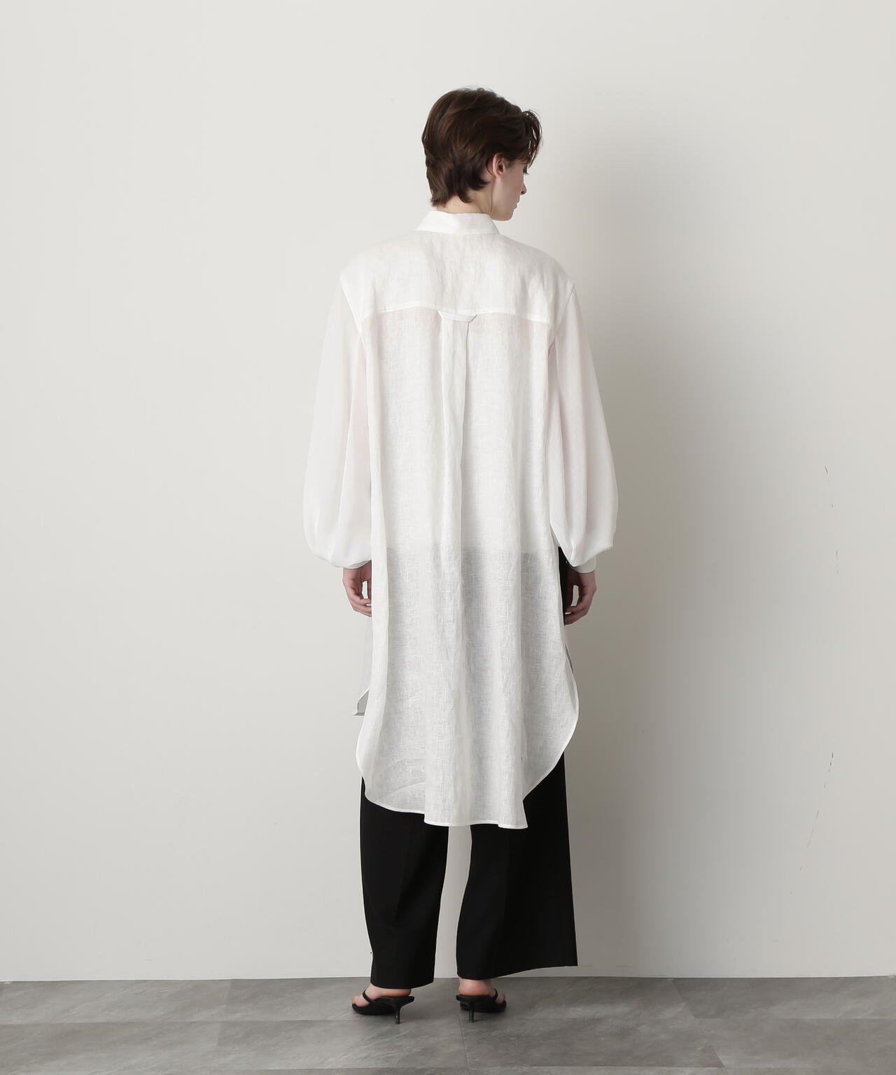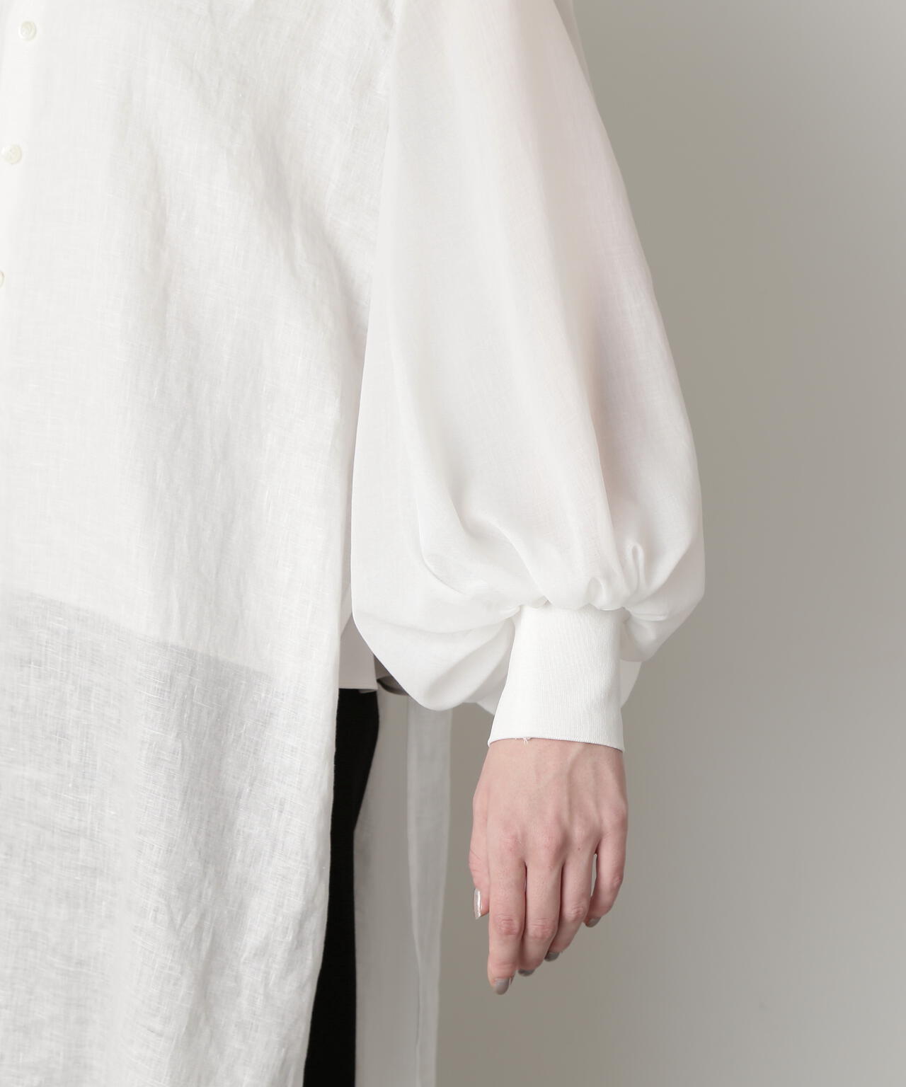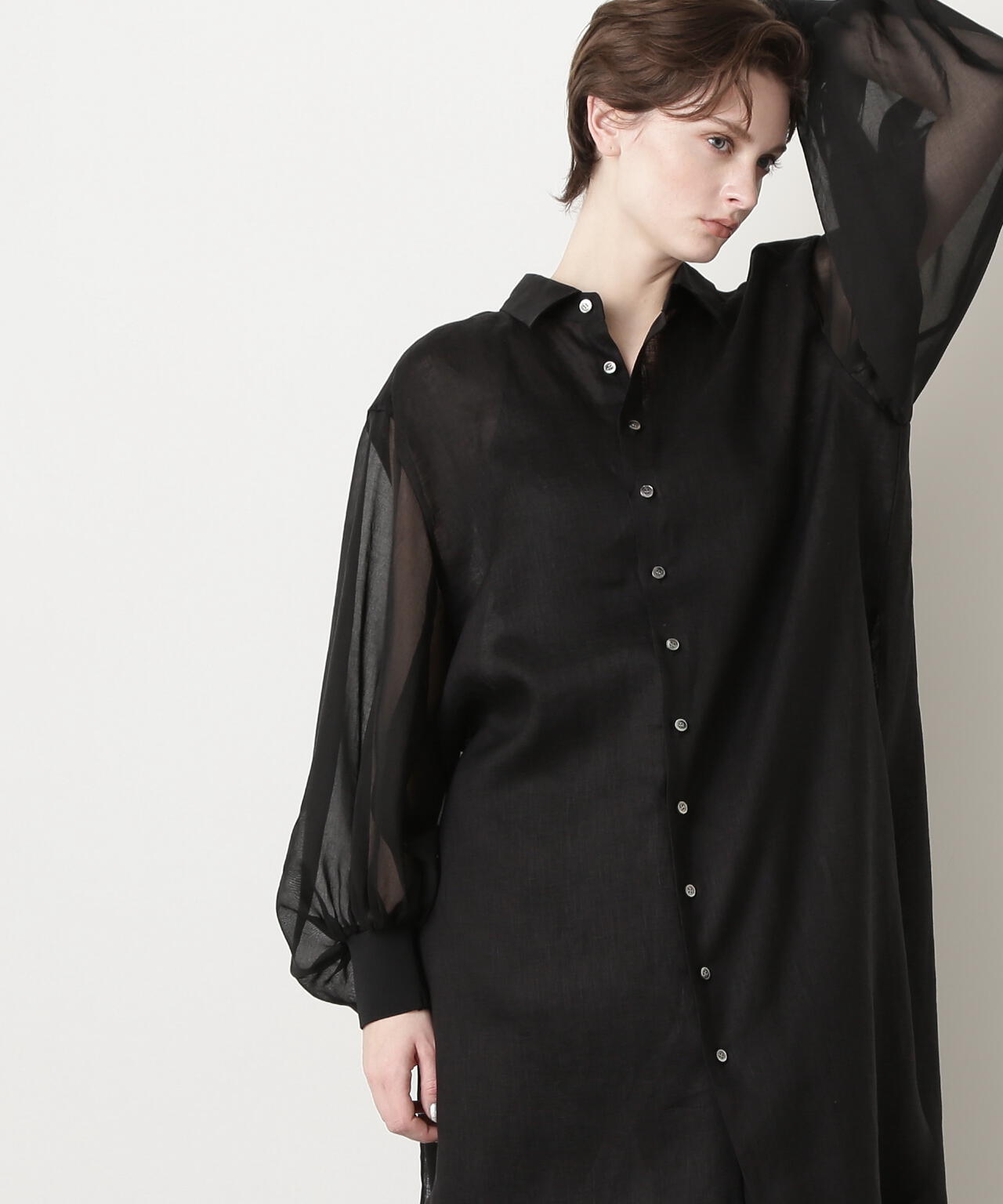 身頃に60/ーのリネン、袖に同系色のオーガンジーを使用したロングシャツです。