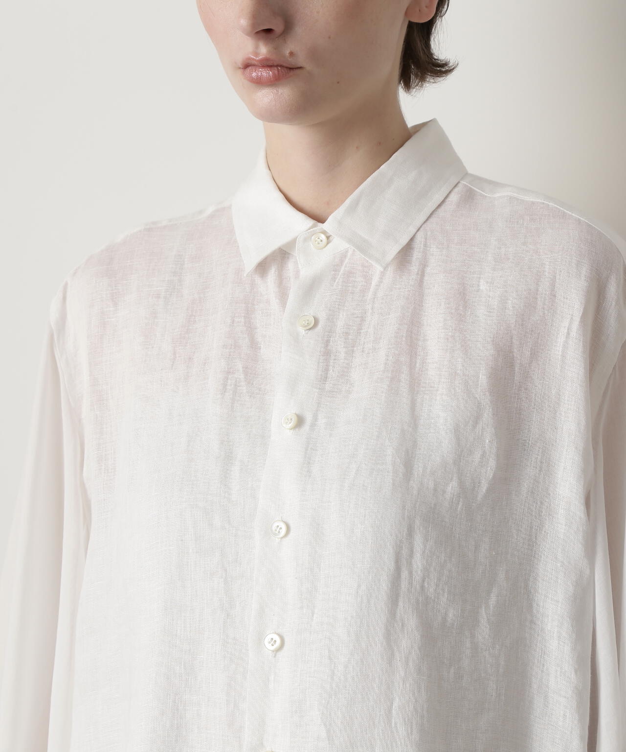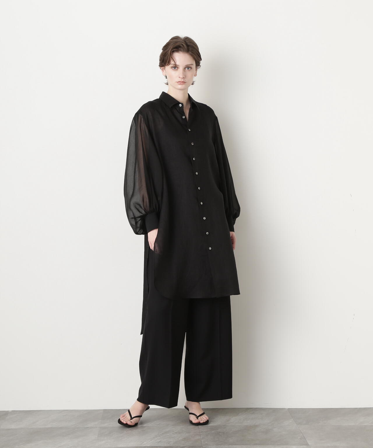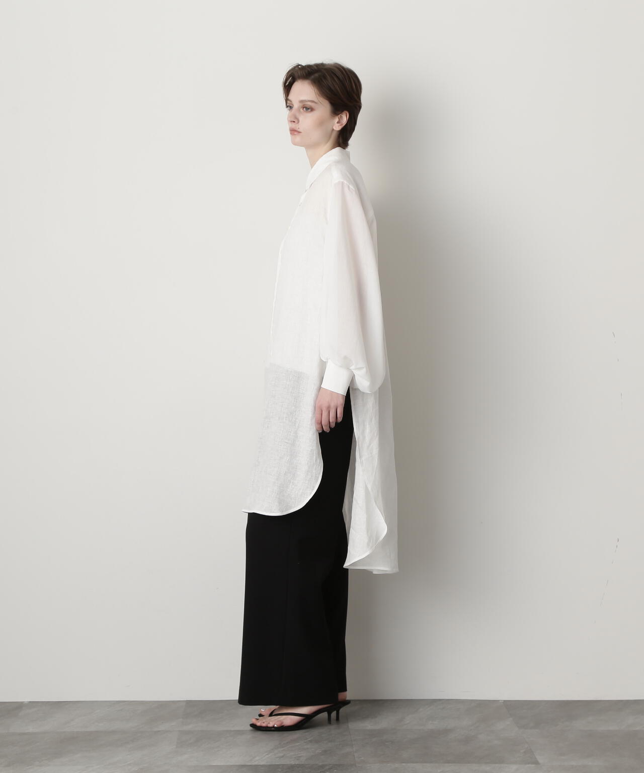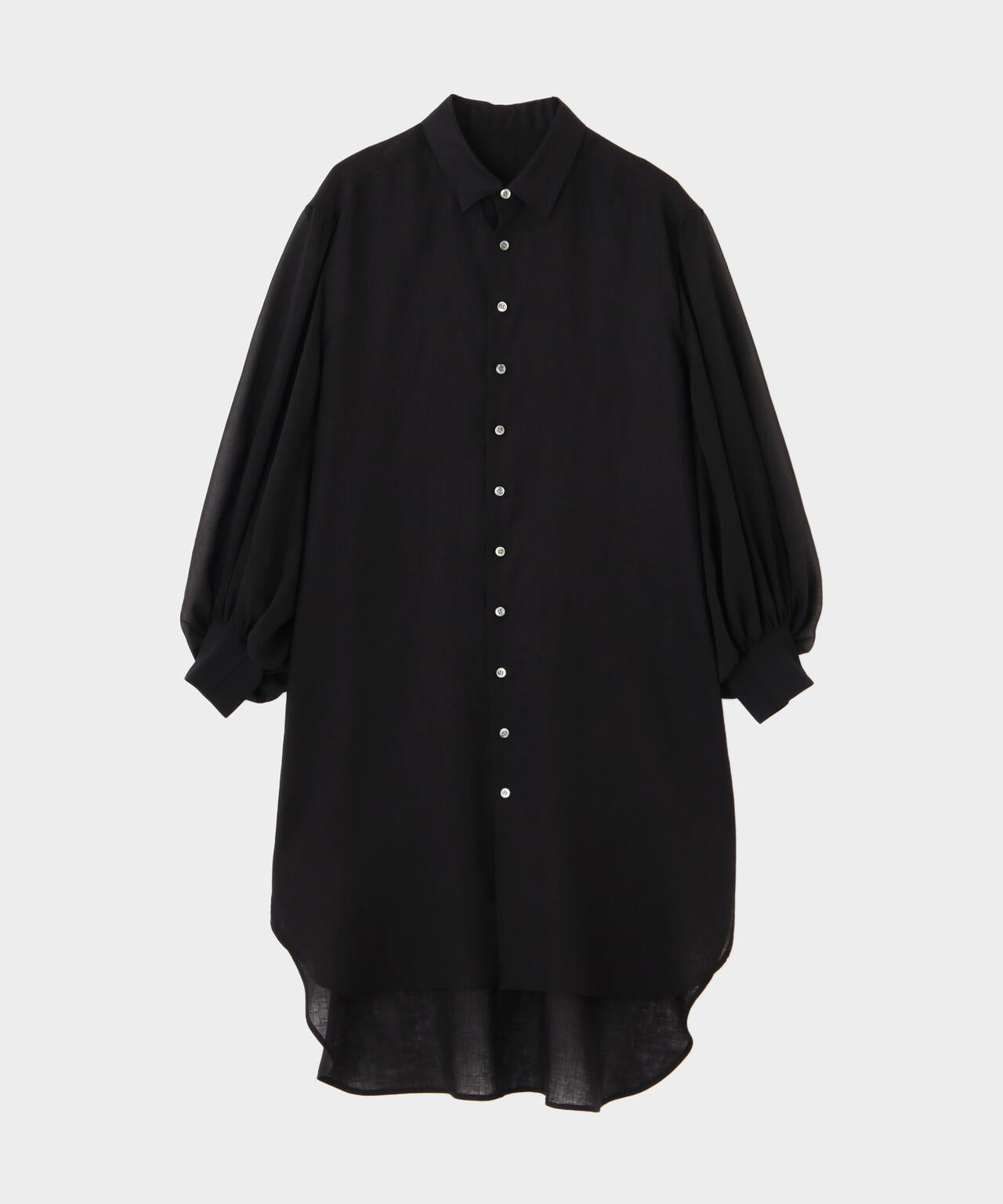 身頃に60/ーのリネン、袖に同系色のオーガンジーを使用したロングシャツです。