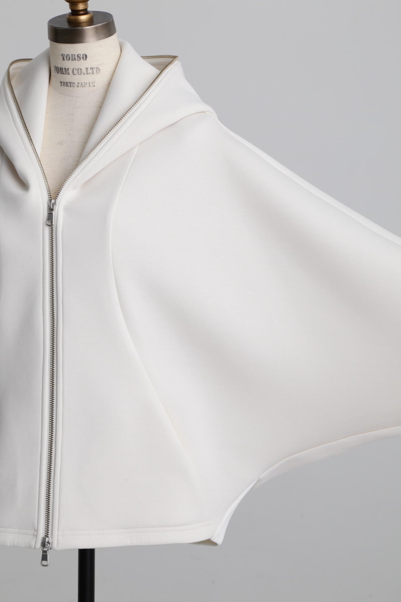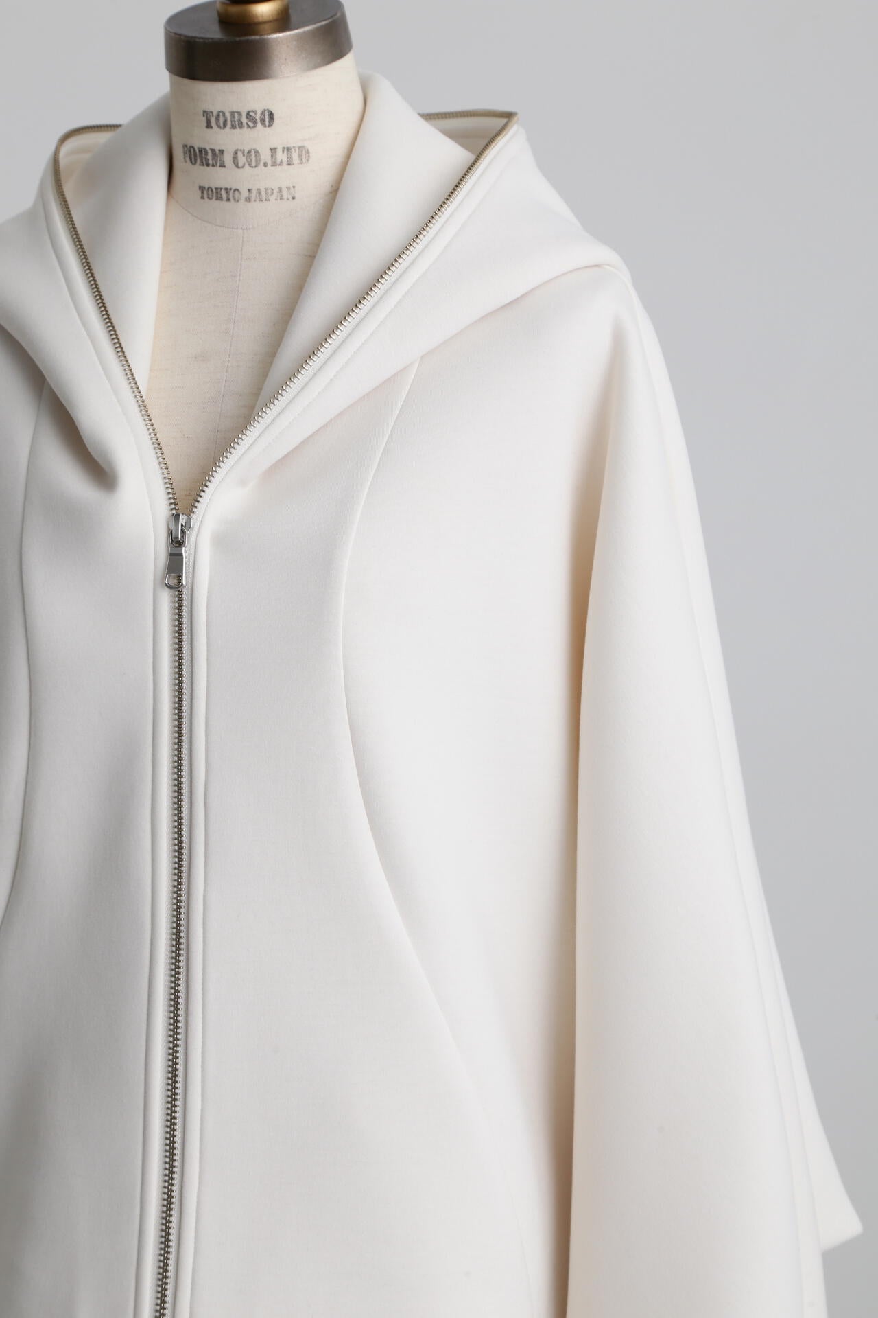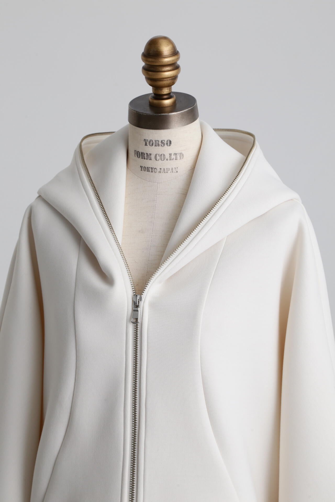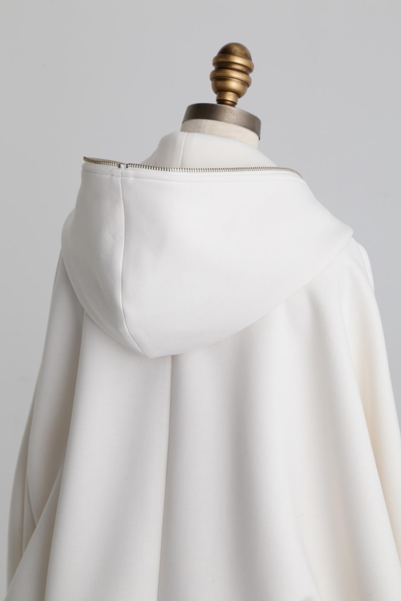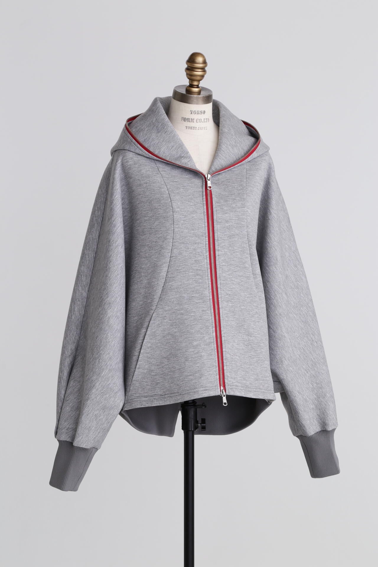 一見するとシンプルなスエットパーカーのようなアイテムですが、カッティングや素材使いなどこだわりのデザインポイントがさまざまな部分に忍ばせてあります。フードの頂点まであるメタルファスナーは全体の雰囲気ををシャープに引き締め、さらに衿の返りを立体的に表現してくれます。袖口には編み立てリブをセットしてアウターらしさを表現しています。後身頃にボリュームのあるシルエットは特殊なパターンで裾線も後ろが下がる設計で、大人が着用して様になるクリーンさとソフトモード感を纏ったパーカーアイテムです。