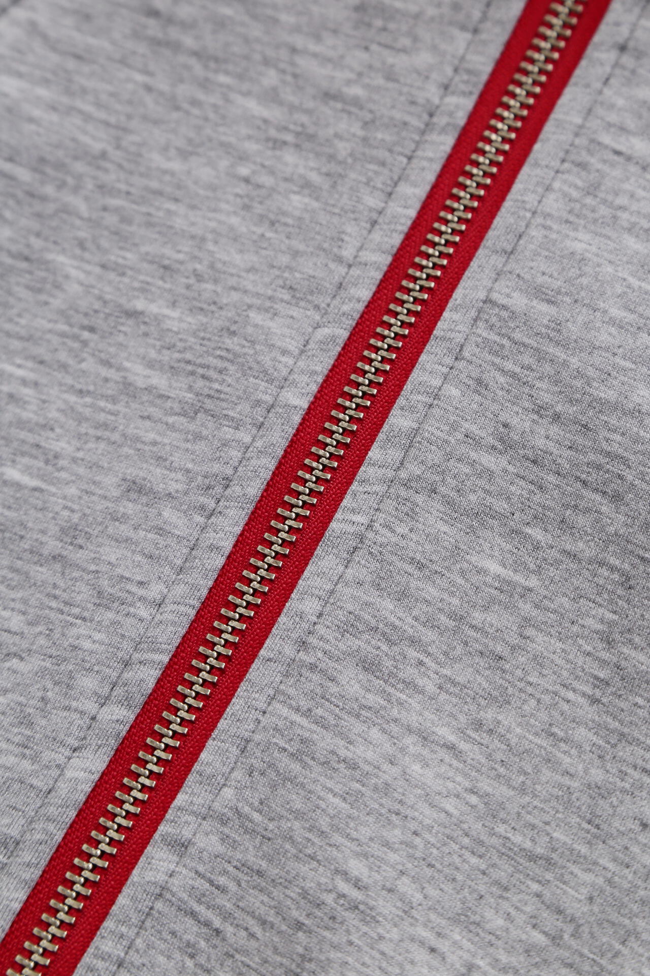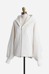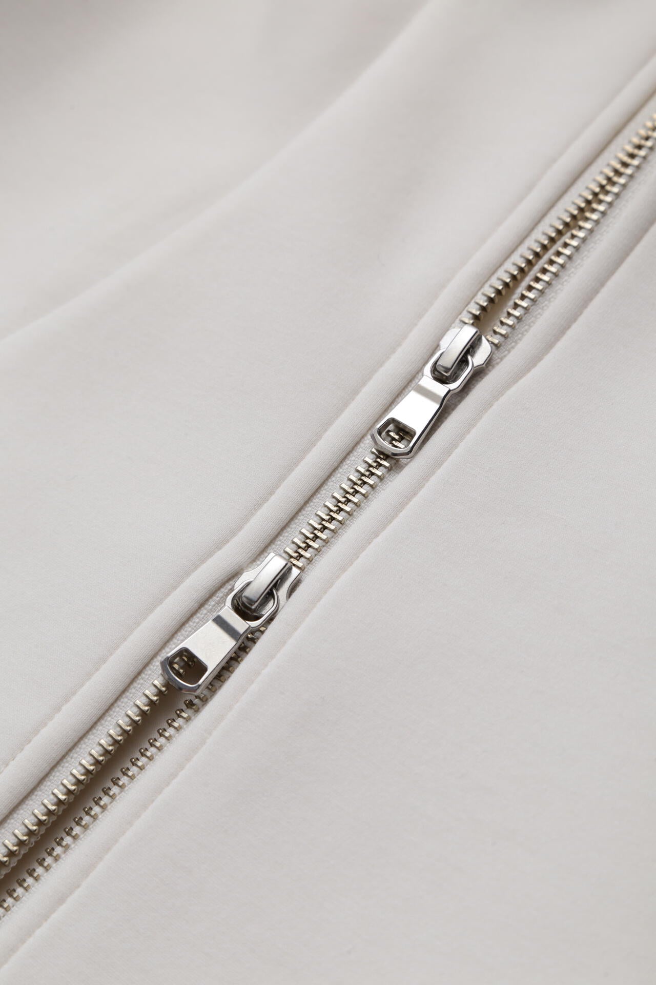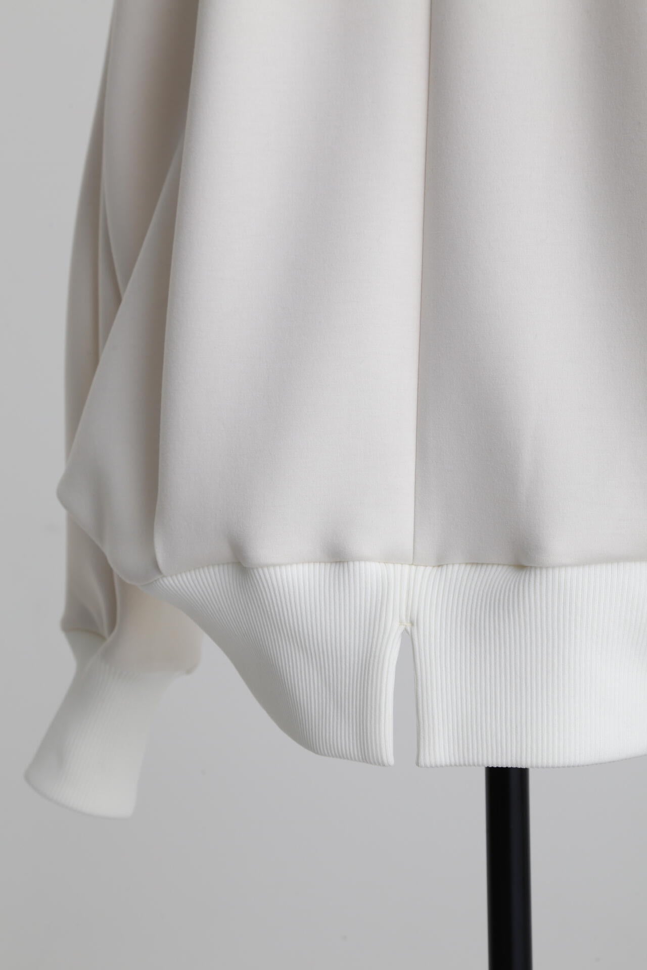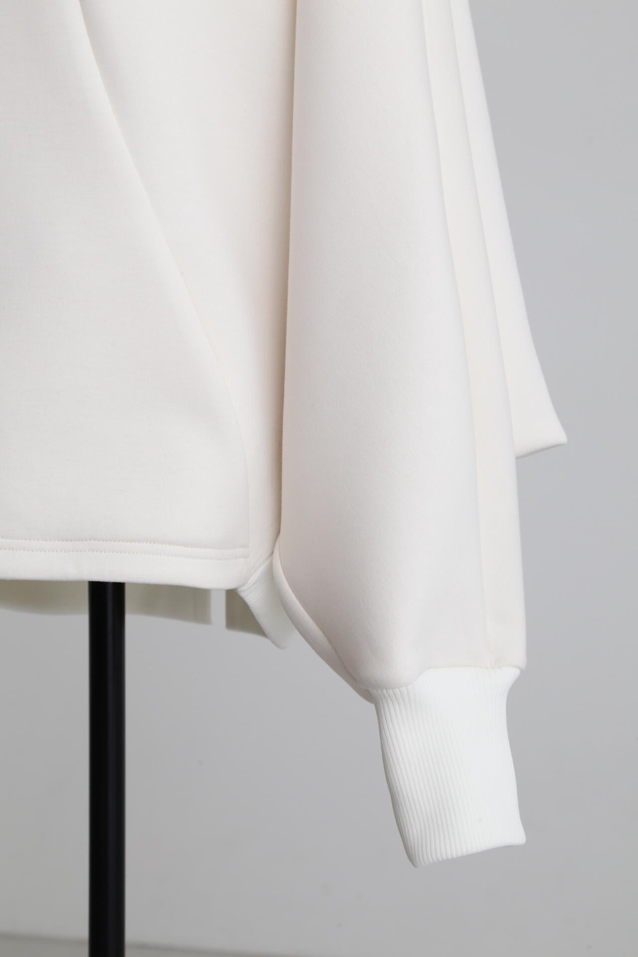 一見するとシンプルなスエットパーカーのようなアイテムですが、カッティングや素材使いなどこだわりのデザインポイントがさまざまな部分に忍ばせてあります。フードの頂点まであるメタルファスナーは全体の雰囲気ををシャープに引き締め、さらに衿の返りを立体的に表現してくれます。袖口には編み立てリブをセットしてアウターらしさを表現しています。後身頃にボリュームのあるシルエットは特殊なパターンで裾線も後ろが下がる設計で、大人が着用して様になるクリーンさとソフトモード感を纏ったパーカーアイテムです。