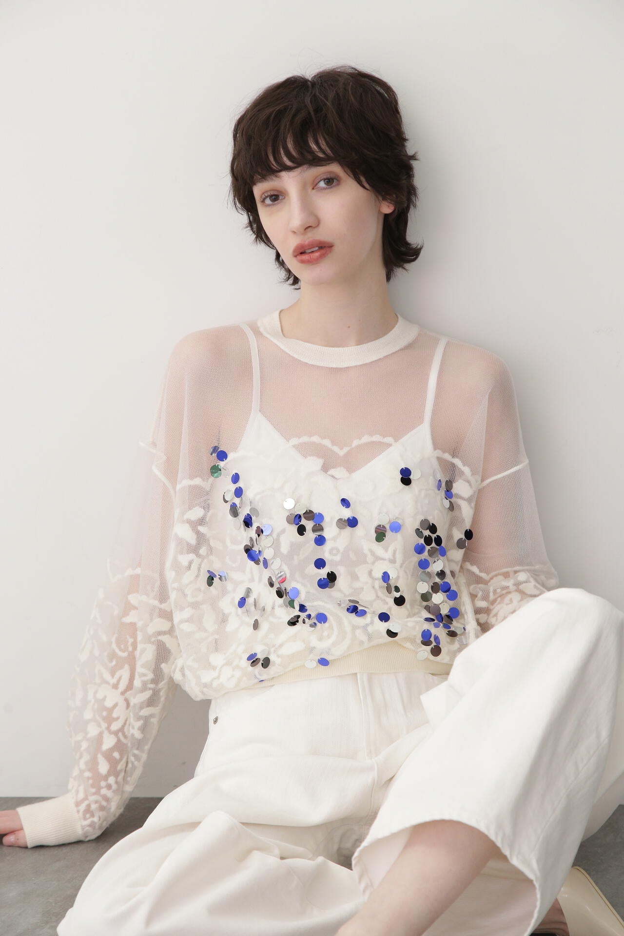オパール加工というウールを溶かす技術を使い、レース調の柄を表現したシアーニットに大胆にスパンコールを散りばめました。ボディーはゆったりとした身幅にやや短めの着丈で、レースのエレガントさを押さえ程よくカジュアルモードなムードに。肩周りは柄を消しシアー感をしっかりと出しクリーンな印象に仕上げています。そこにさらに3色使いのスパンコールをトッピングすることでエレガンスモード感あるニットに仕上げました。