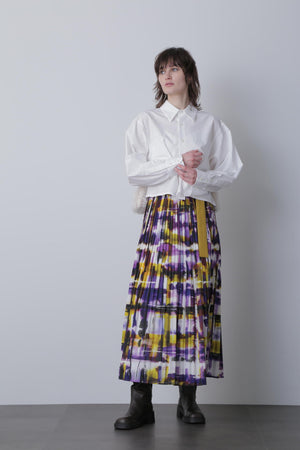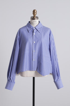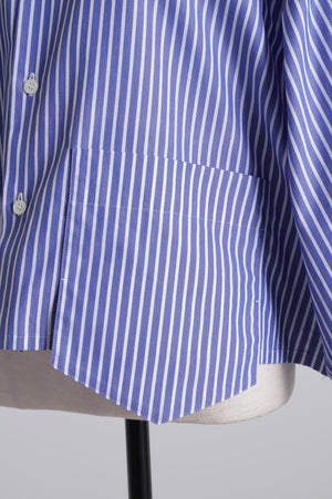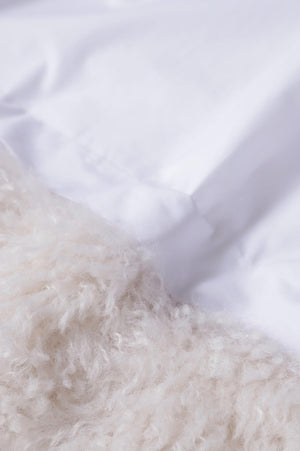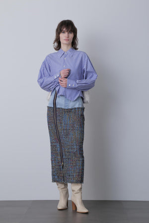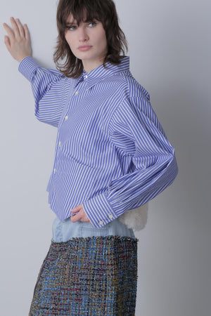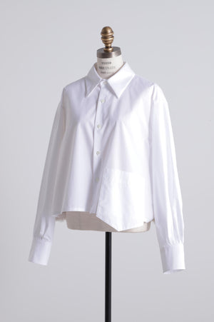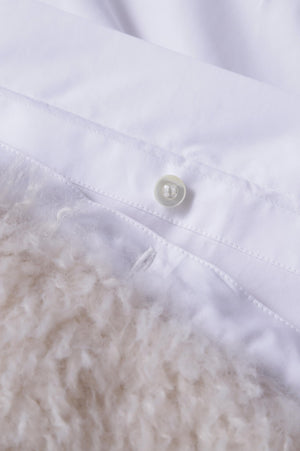 アンバランスなディテールが印象的なクロップドシャツ。シンプルなクロップドシルエットをベースに、身頃からはみ出したポケット位置や後身頃裾に取り外し可能なフェイクファーパーツをあしらい、前後で異なる表情を楽しめるデザインに仕上げました。フェーパーツは立体感を出すために表裏両面にファーを使用し、薄手の中綿を加えることでふっくらとしたボリューム感を演出。軽やかでありながら存在感のある仕上がりで、日常のスタイリングに遊び心と高級感をプラスする一着です。