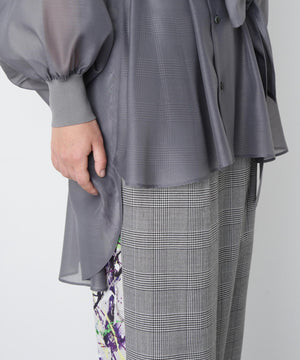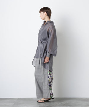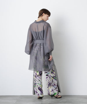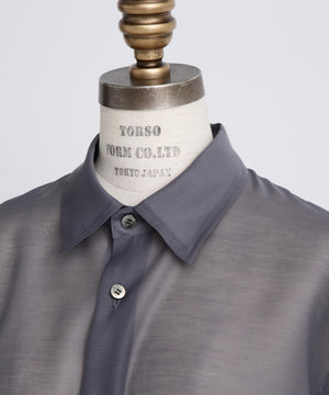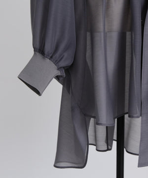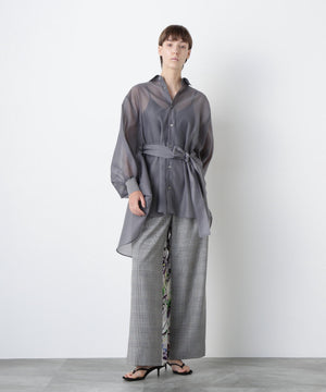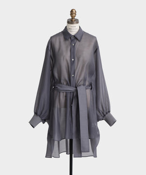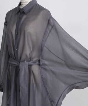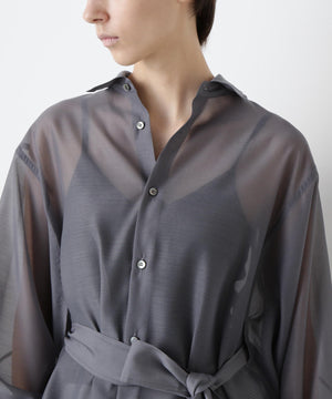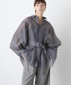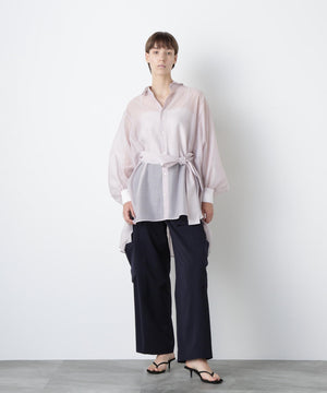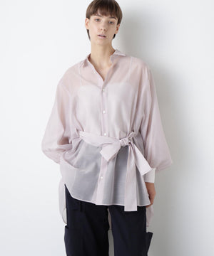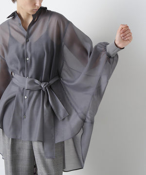ポンチョのようなゆったりとしたシルエットが魅力のベルテッドシャツ。身頃はたっぷりとボリュームを持たせつつ、カーブ切替のドルマンスリーブが優美なフォルムを演出します。スリーブの切替に通した共素材のリボンで、軽くウエストマークすることで自然な立体感が生まれ、羽織りとしても着回し自在。袖口には同色のリブを配し、たくし上げもスムーズに。袖のボリュームを自由に調整できるのも嬉しいポイント。ボディと衿はミニマルに、シェルボタンで上品に仕上げました。