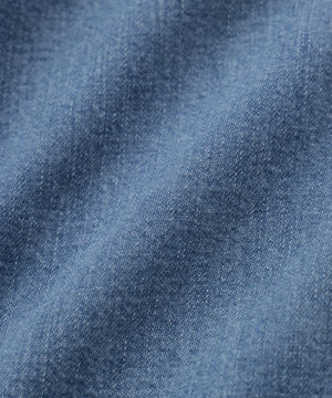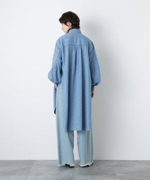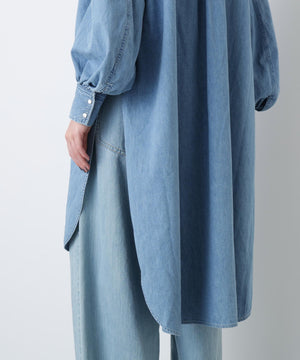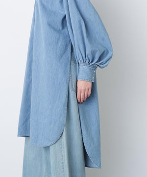 クラシカルな雰囲気のロングシャツ。8ozの中肉デニムを使い、ワンピースとしても羽織りとしても楽しめる汎用性の高い一枚です。ウエスタンシャツを思わせるパールドットボタンや配色ステッチがアクセントになり、デニムの魅力を引き立てます。アイスブルーにはホワイト、インディゴブルーには金茶の糸を用い、さりげなくクラシックな印象に。ロング丈とボリュームスリーブが今の気分を映し出し、日常のスタイリングにモードな存在感をプラスします。