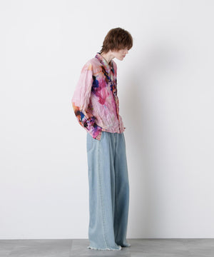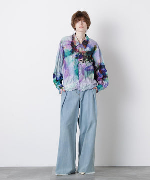 アート性が際立つプリントシャツ。19世紀の印象派の色彩と光の余韻から着想を得た色使いに、コンテンポラリーアーティスト・佐々木香菜子氏の解釈を重ねて描き起こした、STUMBLYオリジナルのアート図案を採用。素材はポリエステルのタイプライターに岩のようなプリーツ加工を施し、奥行きのある質感に。ゆったりとしたシルエットに、前下がりのワンナップカラーとタックで表現した袖のボリューム、スクエアカットの裾が、80〜90年代のタイプライタームードを漂わせます。