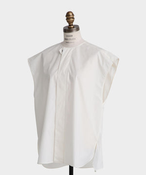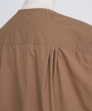 夏の装いに涼やかさを添える、フレンチスリーブのノーカラーシャツ。高密度タフタ素材を採用し、軽やかなのにしっかりとしたハリ感があり、ジレ感覚で羽織としても活躍する一枚です。フロントはボタンを隠したフライフロント仕様で洗練された印象に。さらに第1ボタンだけが少し覗くように設計されており、シンプルな中にも個性が光る、STUMBLYらしいひねりの効いたデザインです。一枚でもレイヤードでも様になる、万能な夏の定番に。