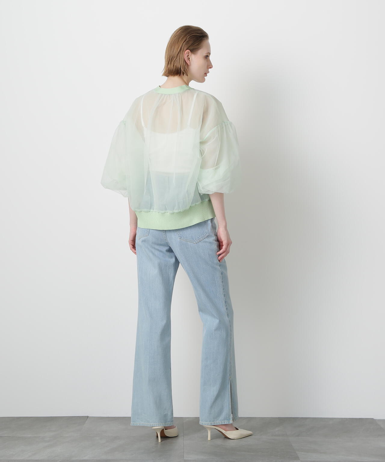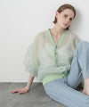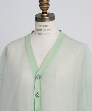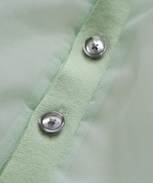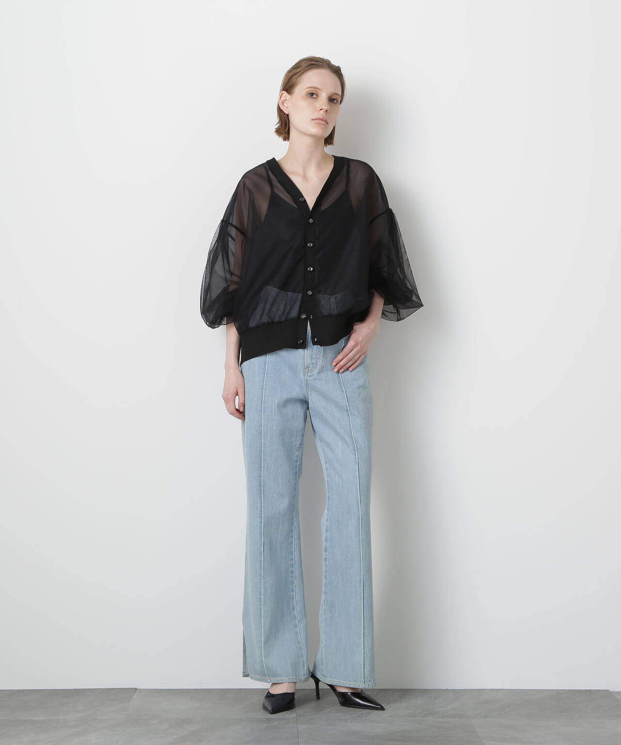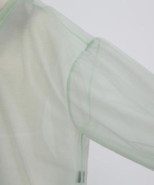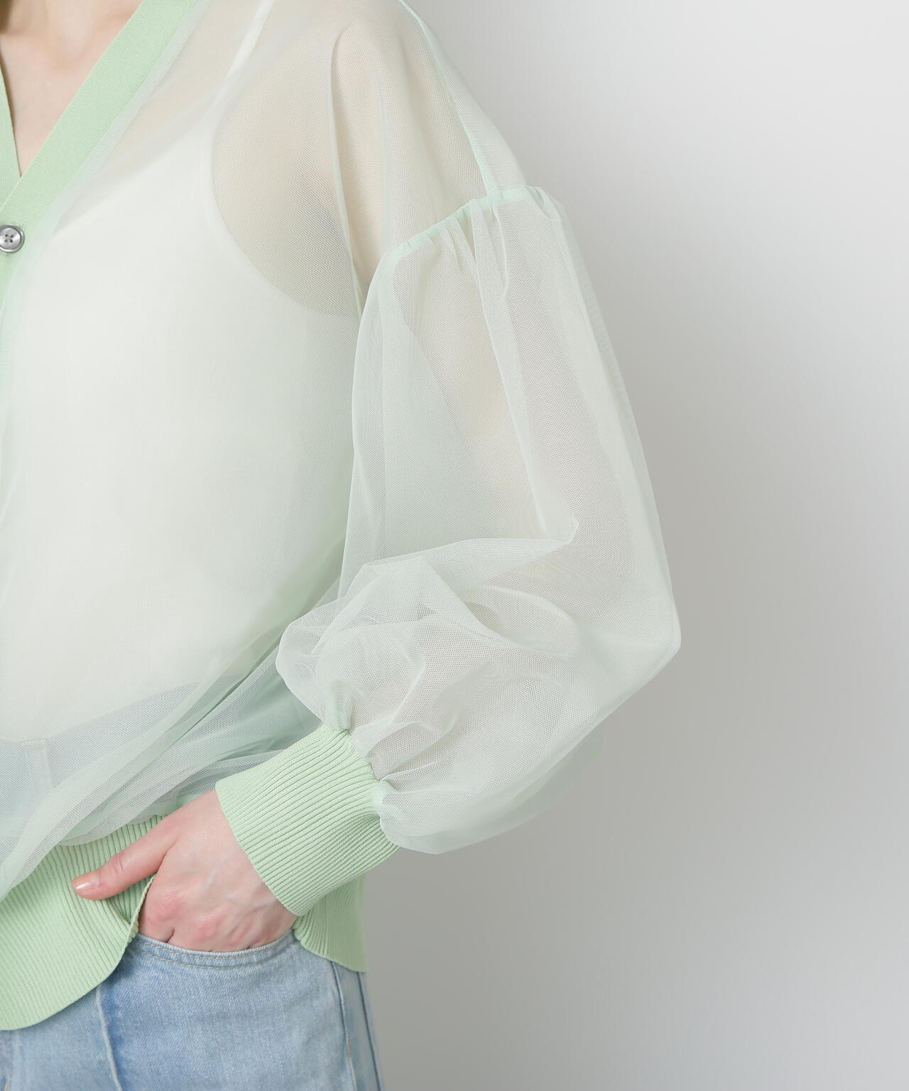 オーガンジーとチュールの二重仕立てで仕上げた華やかなカーディガン。内側のオーガンジーはゆったりとしたサイズ感でリラックス感を演出し、外側のチュールにはギャザーをふんだんに施し、たっぷりとしたボリューム感をプラス。二枚の素材が優雅に重なり合い生まれる陰影が立体的な表情を作り出し、モアレ(光の干渉による縞模様)を抑える工夫も施されています。軽やかな透け感と奥行きを楽しめる一枚です。