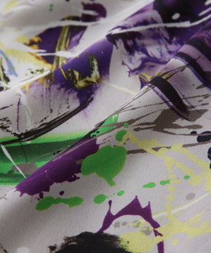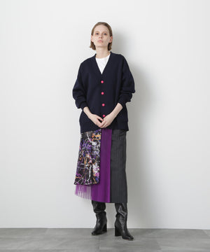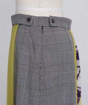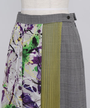 20世紀アメリカの抽象画家から着想を得たインダストリアルなアートムードが際立つオリジナルプリントを用いた異素材コンビネーションスカート。スタンダードでマニッシュな梳毛素材のアイラインスカートをベースに、ドットボタンで取り外し可能なプリントオーバースカートとチュールプリーツスカートをウエストベルトにセット。アイラインスカート単体はもちろん、チュールスカートのみや全てを組み合わせて、多彩なスタイルと表情を楽しめる贅沢な一着です。