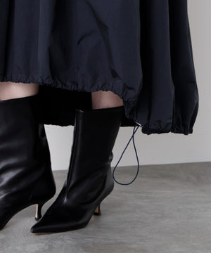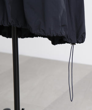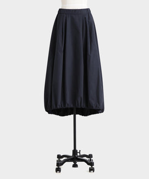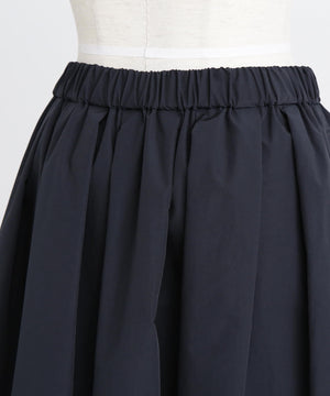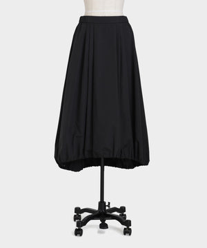 シルクのようなピーチタッチが上品なポリエステルナイロン高密度タフタを使用したスカート。割繊糸ならではのカサカサとしたハリ感が美しいボリュームを生み出します。ウエストはゴム仕様で楽に着用でき、裾のボムスピンドルを絞ることでバルーンシルエットにもアレンジ可能。カジュアルながらも洗練された風合いが魅力の一着です。