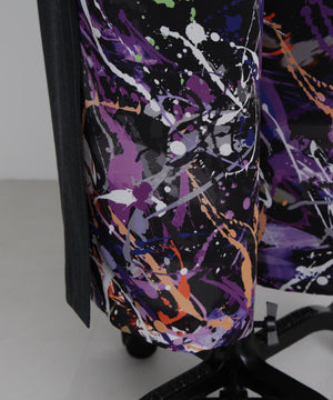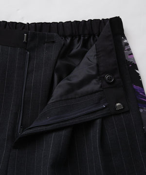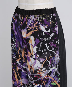 20世紀アメリカの抽象画家から着想を得たインダストリアルなアートムードを映し出すオリジナルプリントを使った異素材コンビネーションパンツ。2タックのワイドシルエットに、両裾脇のベントが揺れ動き優雅な動きを演出します。ウエストは総ゴム仕様で快適な履き心地を実現。STUMBLYらしいハイブリッドな素材使いが個性を際立たせる一着です。