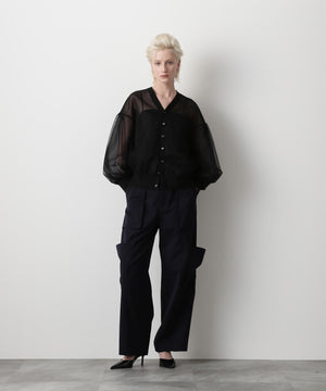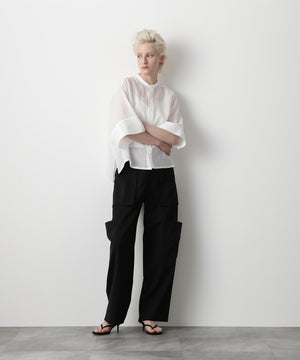 ベイカーパンツとカーゴパンツを現代風に融合させたハイブリッドパンツ。ソフトな曲線が美しいコクーンシルエットをベースに、立体感のあるベイカーポケットが特徴です。脇のカーゴポケットは身頃とつながる切り替えで、すっきりとしたラインを演出。強撚梳毛のウールナイロントロピカル素材を使用し、シルクウールとは異なるクリーンでオーセンティックな印象に仕上げています。さまざまなシーンで洗練された着こなしを叶える一本です。