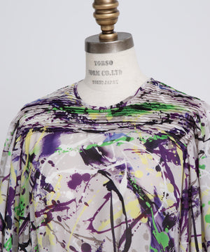20世紀アメリカの抽象画家からインスピレーションを受けたインダストリアルなアートムードを表現したオリジナルプリントを用いたワンピース。衿から肩にかけて施した横向きのピンタックが華やかな印象を与え、顔周りを美しく演出します。袖はピンタックの分量を活かし、ふんわりとしたボリュームスリーブに仕立てました。スカート部分は縦プリーツでピンタックと調和し、統一感ある洗練されたデザインです。