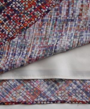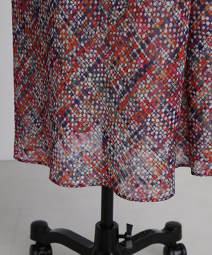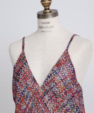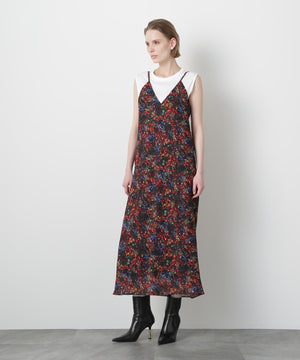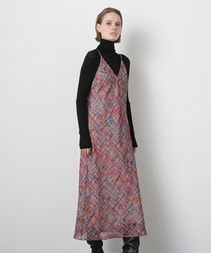 オリジナル転写プリント素材を贅沢に使用したマキシフレアドレス。海外プリントスタジオ製のツイード調柄と、繊細な総小花柄の2種展開です。無地ではなくジャカード素材にプリントを重ね、立体感ある豊かな表情を実現しました。シンプルなキャミソールデザインで、生地はバイアス取り。たっぷりの分量と長めの丈感で女性らしいシルエットを演出します。暑い季節はタンクトップやTシャツと合わせて涼しく、肌寒くなればジャケットやタートルネックのレイヤードも楽しめる万能な一着です。