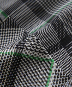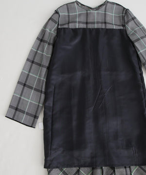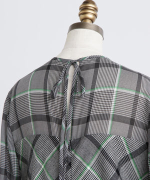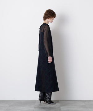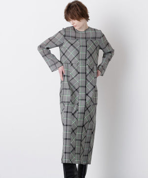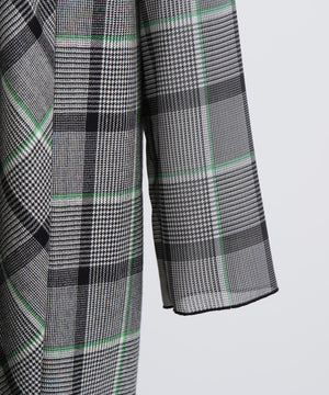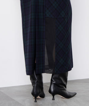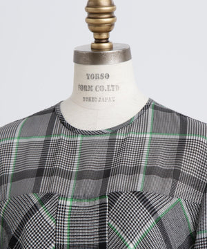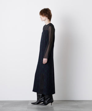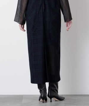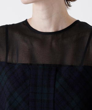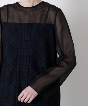ウールのライトウエイトサキソニー素材とシアーオーガンジーを組み合わせたドレス。グレンチェック柄はウールを本体に、同柄プリントのシアオーガンジーを部分的にあしらい、ブラックウォッチ柄は無地ブラックのシアーオーガンジーを使用。ボディ全体をランダムに切り替え、地の目もランダムに使うことでパッチワークのような表情に。歩くたび微かな陰影の変化が楽しめる、大人のためのシアーコンビネーションドレスです。