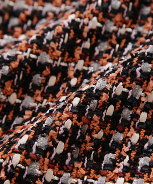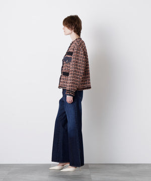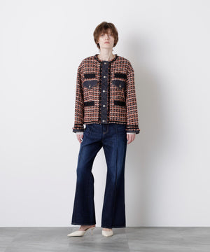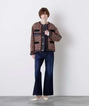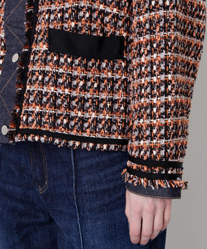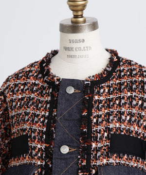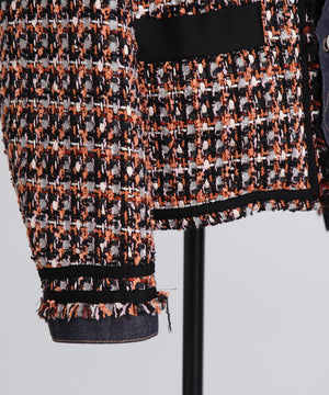 ファンシーツイードのノーカラージャケットにデニムのパーツを組み合わせたリメイク風ジャケット。エレガントなツイードとカジュアルなデニムという異なる素材が織りなすミックス感が、洗練されたモードな印象を引き立てます。遊び心と上品さを兼ね備えた、大人のスタイルにぴったりの一着です。
