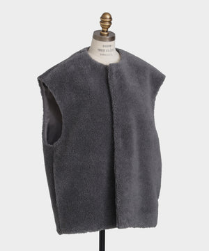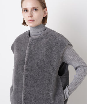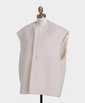 柔らかな質感が魅力のジレ。ECOPEL社のウール混ボア素材を使用し、衿や袖のないシンプルなデザインで仕上げました。秋後半から真冬にかけて、厚みのあるインナーや軽めのトップスとのレイヤードがしやすい、ややゆったりとしたシルエットがポイント。ボアの柔らかさと暖かさを活かしつつ、ジレならではの軽やかさも備え、着こなしに抜け感と上品さをプラスします。冬のスタイリングにも活躍する、汎用性の高い一着です。